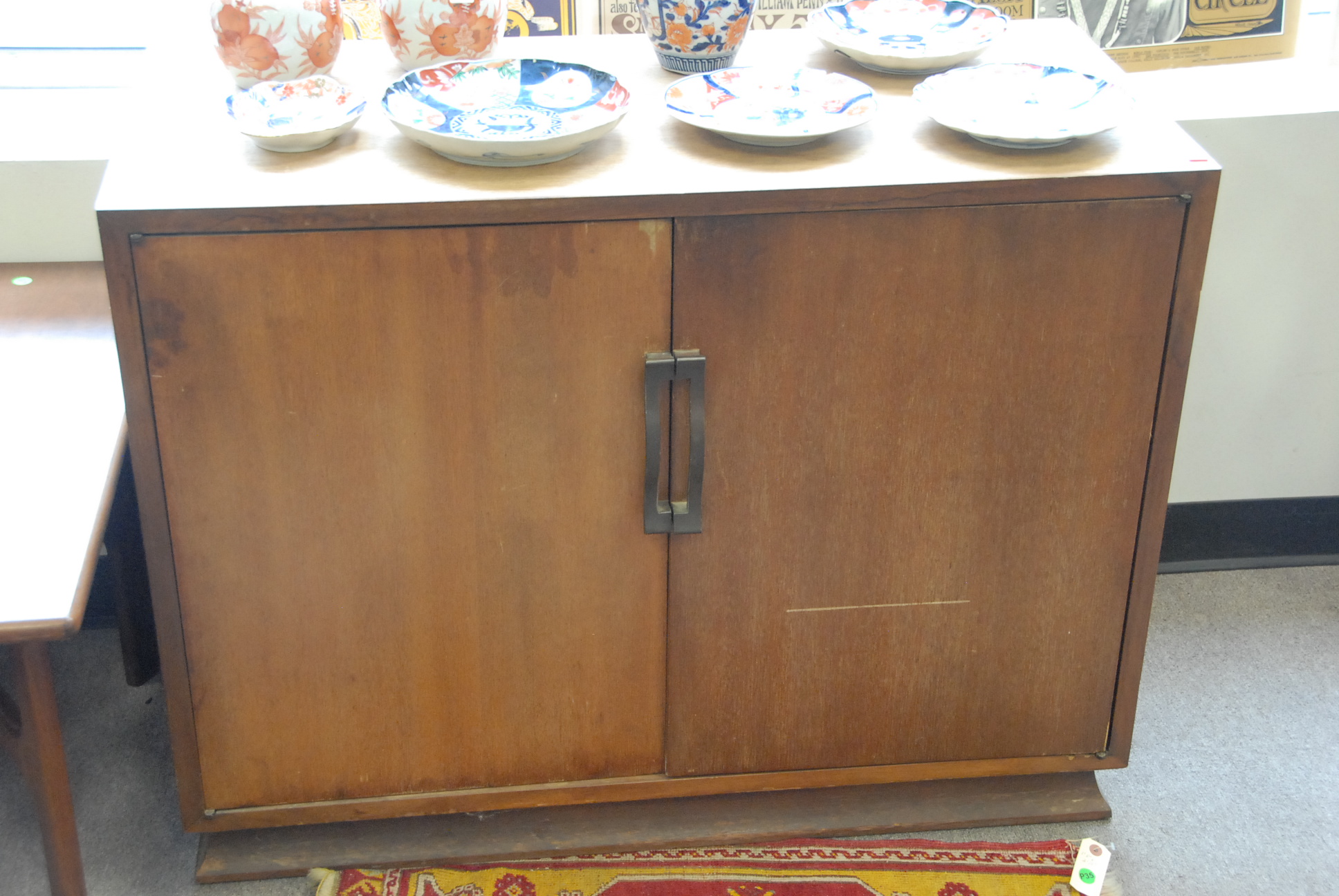 Pair of mid century two door credenzas, as is, marked Morgan masterpiece