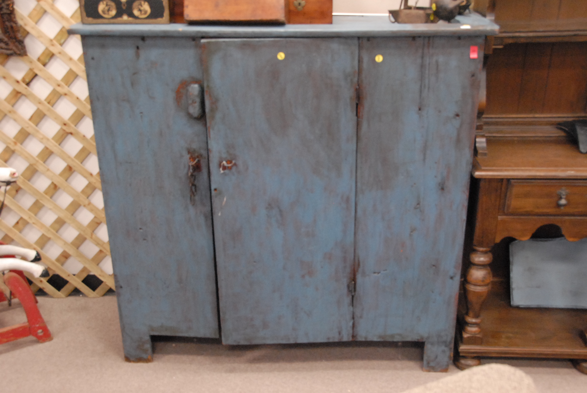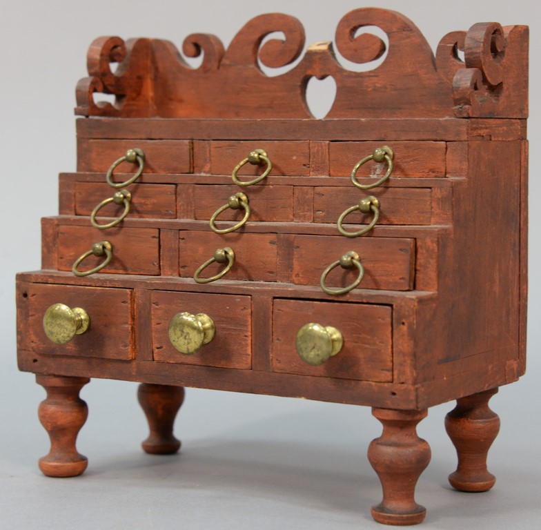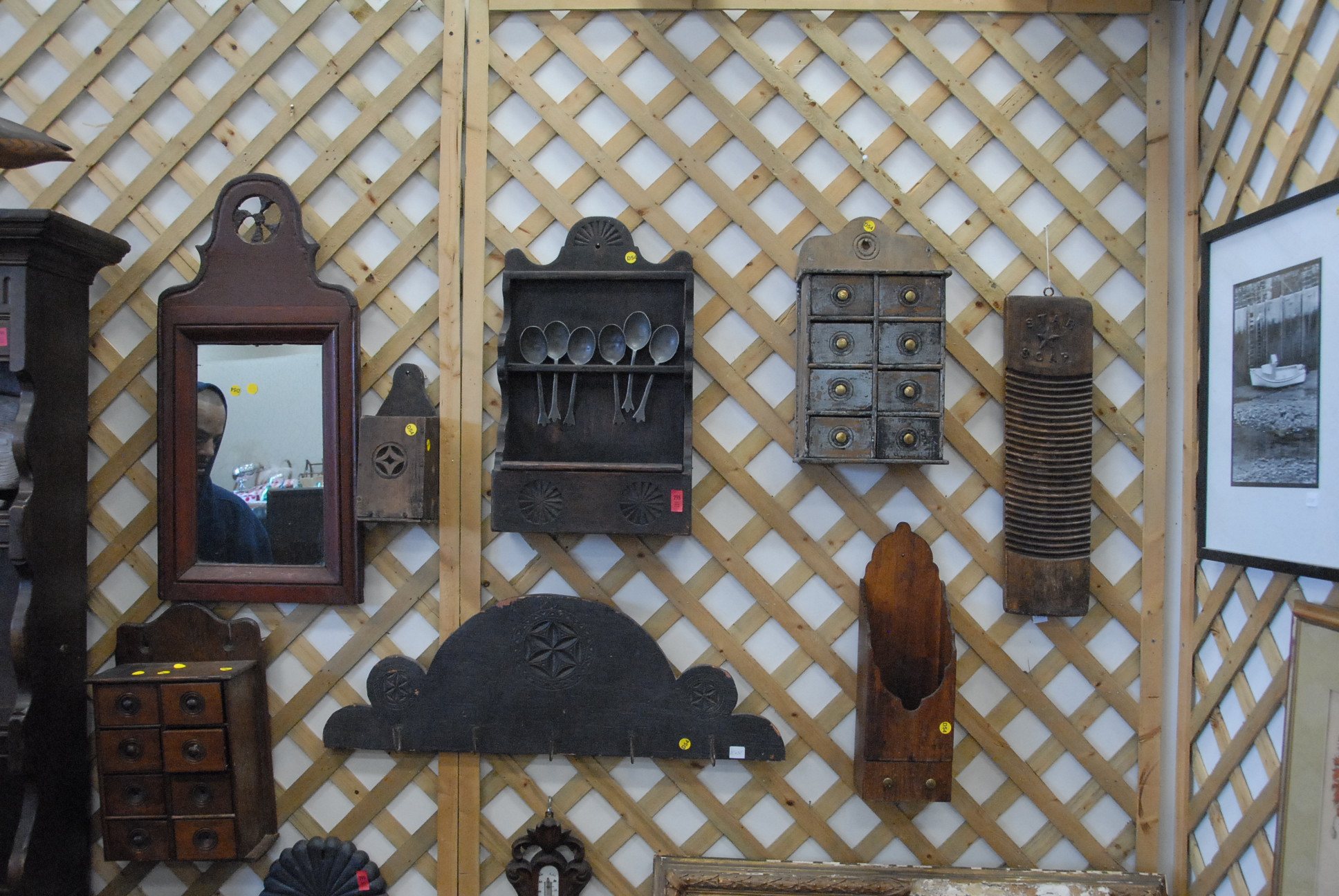 Eight piece lot of primitives to include meat hooks, a pipe box, two hanging spice boxes with eight drawers each, a spoon rack, a mirror