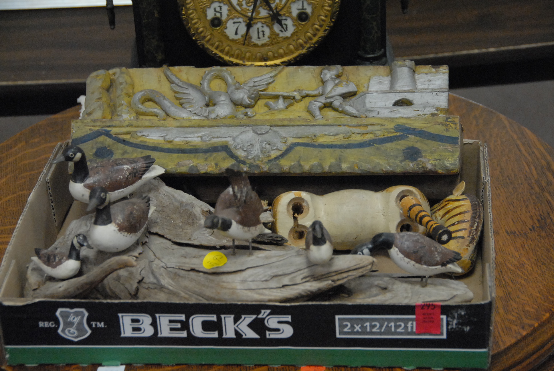 Box lot to include a Schoenhut zebra and miniature carved geese, and a carved wall hanging of a man slaying a dragon
