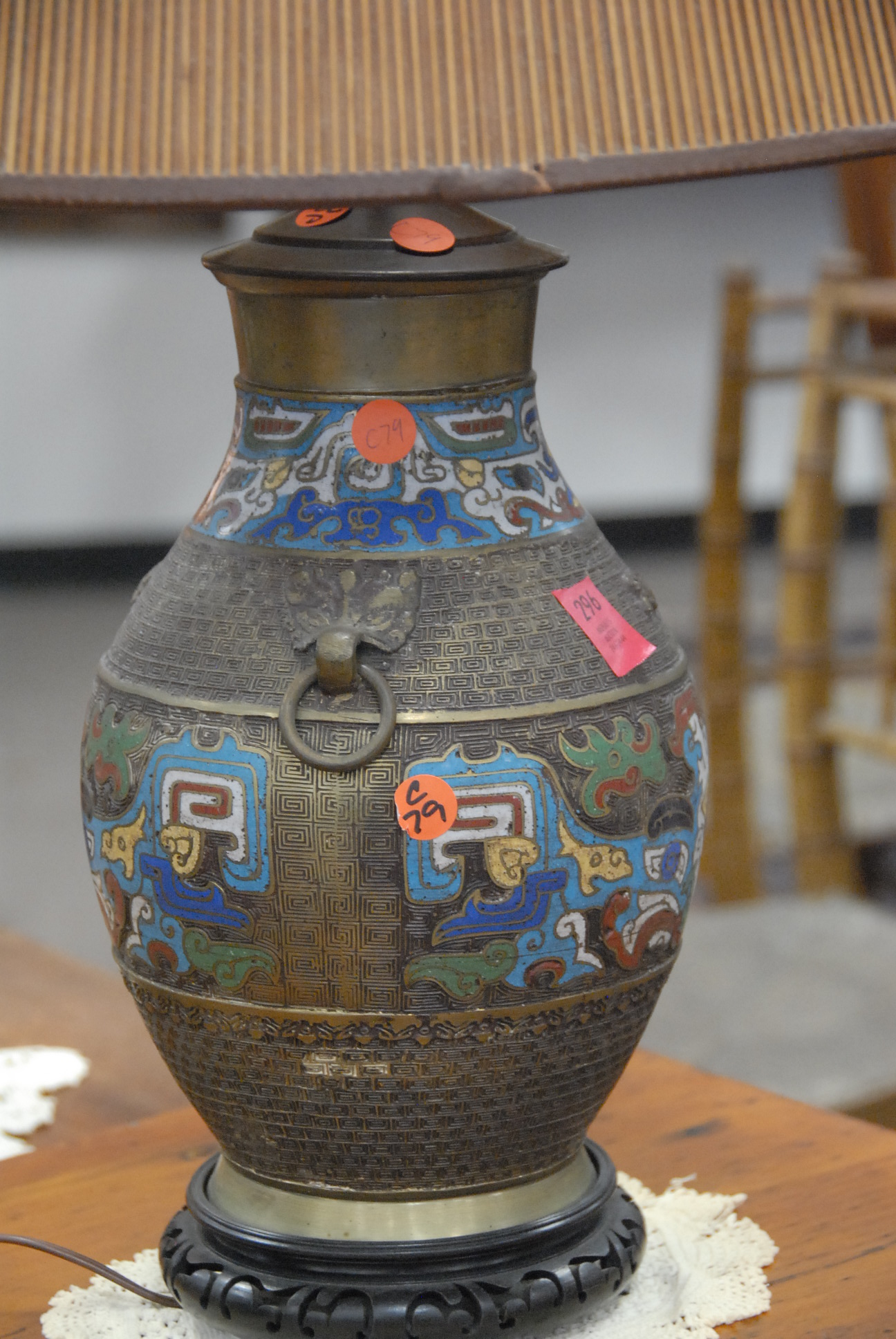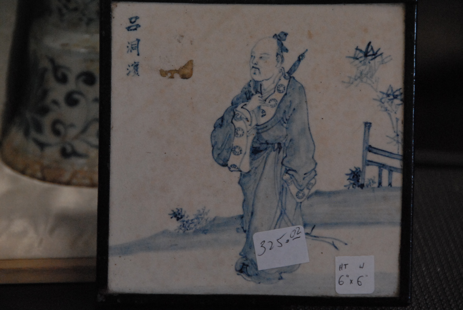 Blue and white Oriental vase, as is, along with a tile with Chinese design