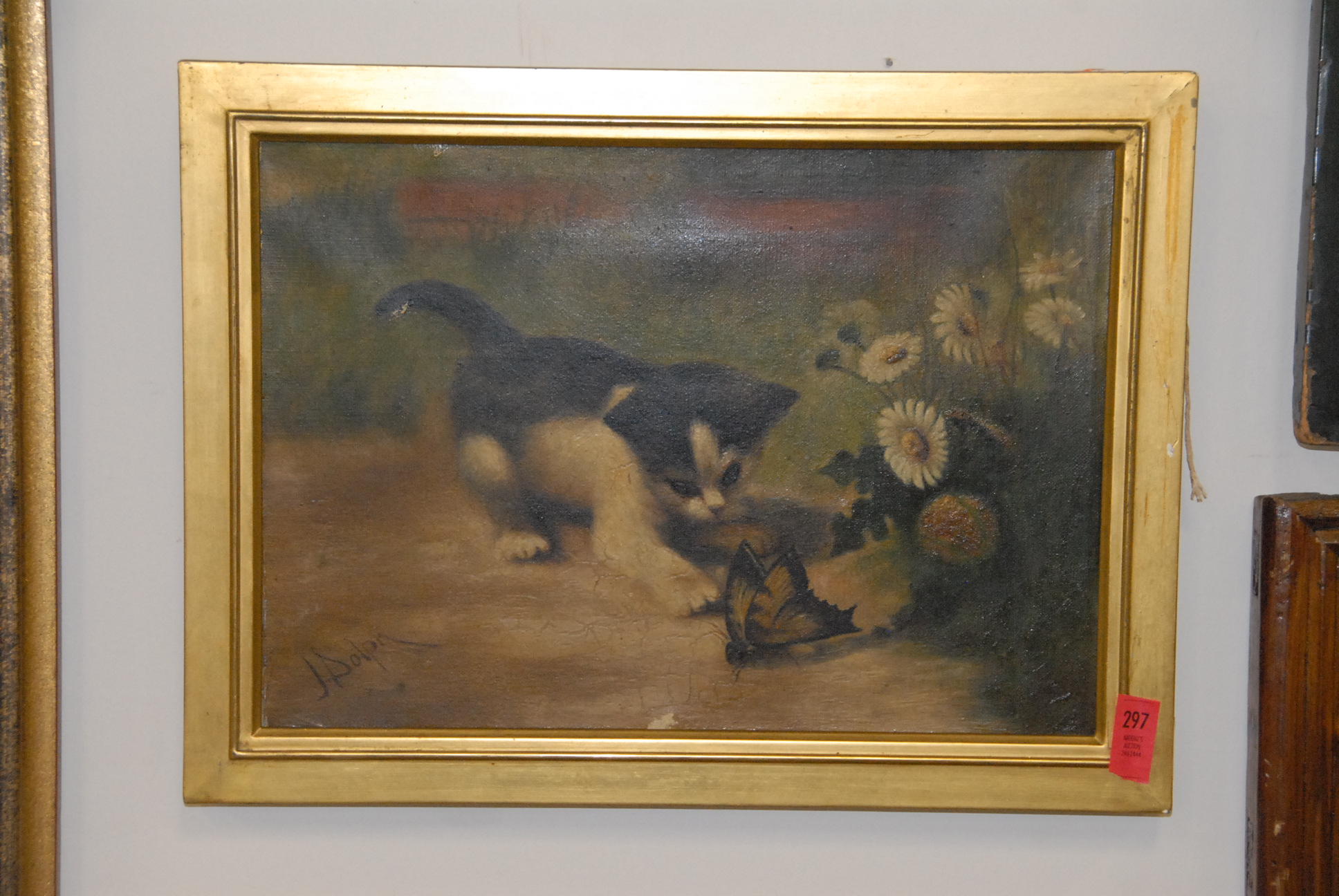 Oil on canvas of a cat and butterfly, signed J. Dolph on the left, initialed WS on the right