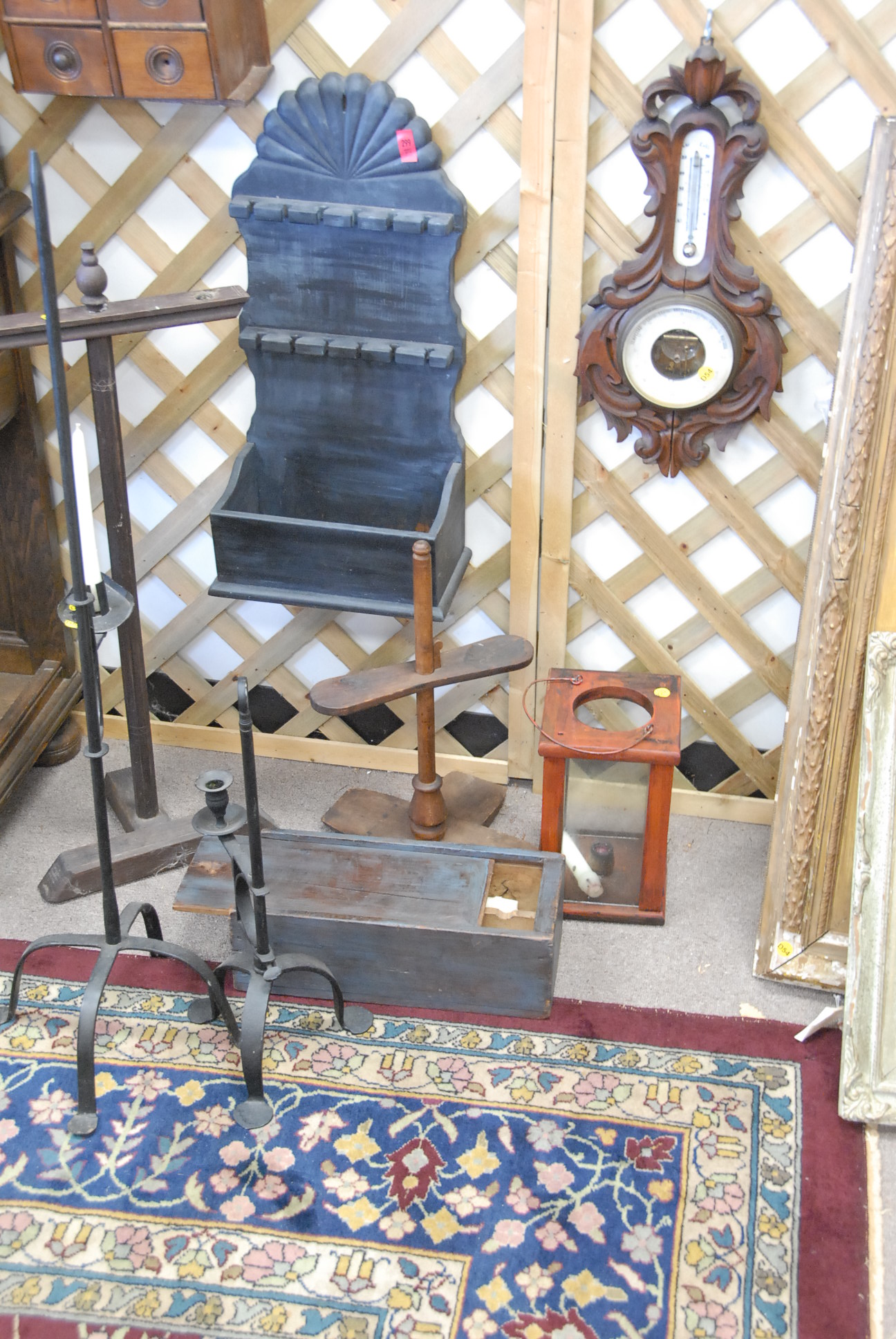 Eight piece lot including a spoon rack, two metal candle holders, yarn winders, candle box, a lantern, and a barometer