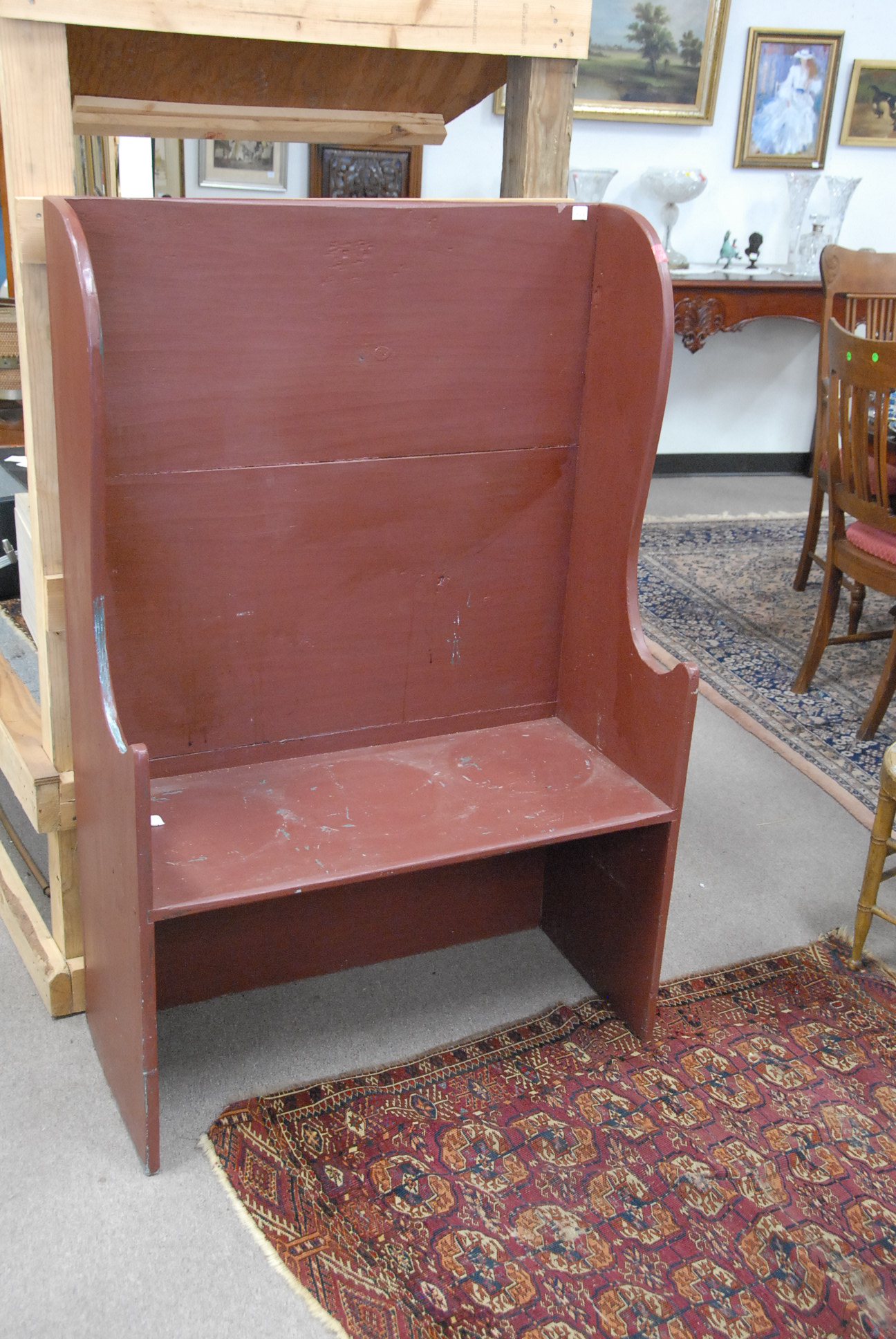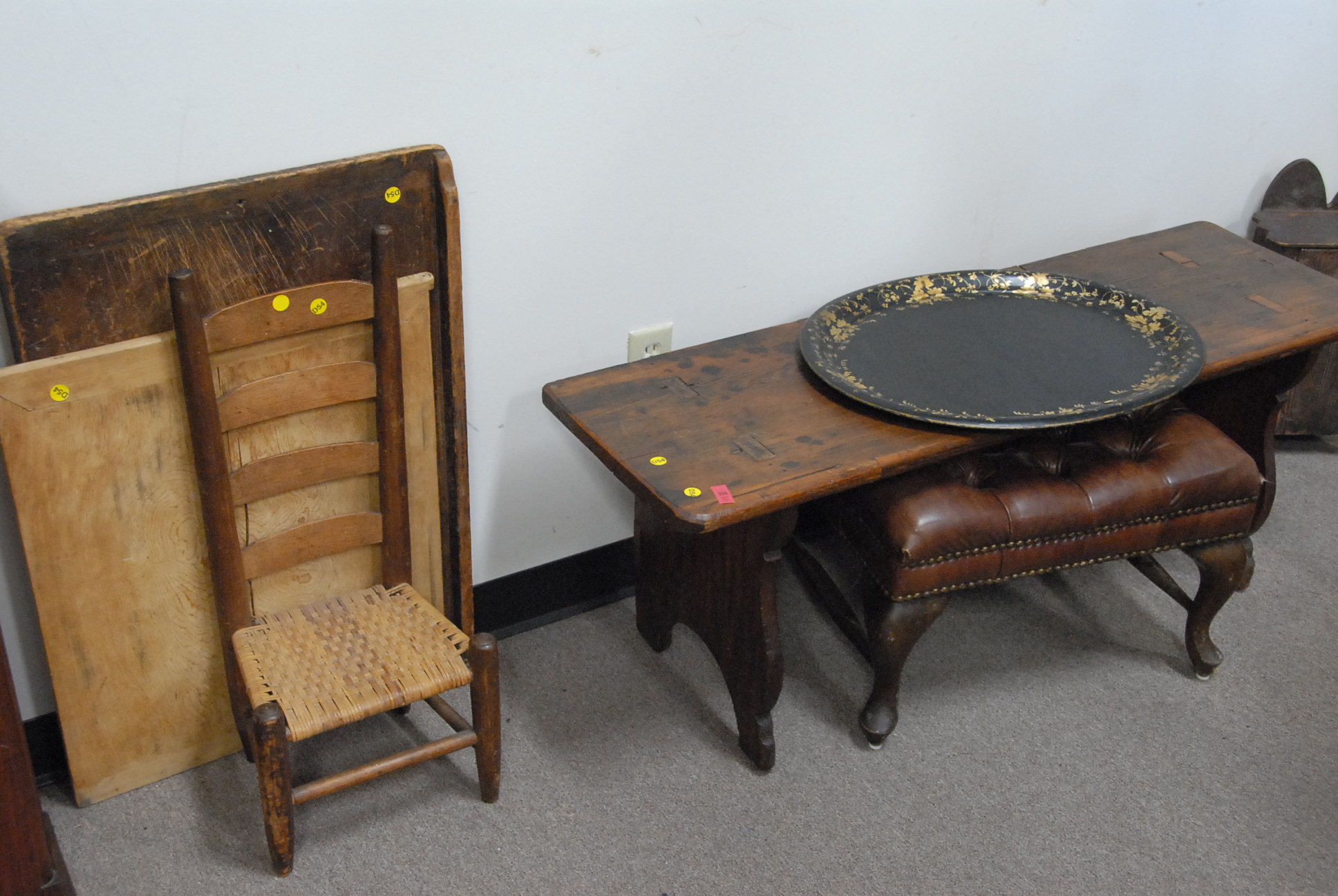 Group lot to include two cutting boards, foot stool, bench, tole tray, and a child’s ladder back chair