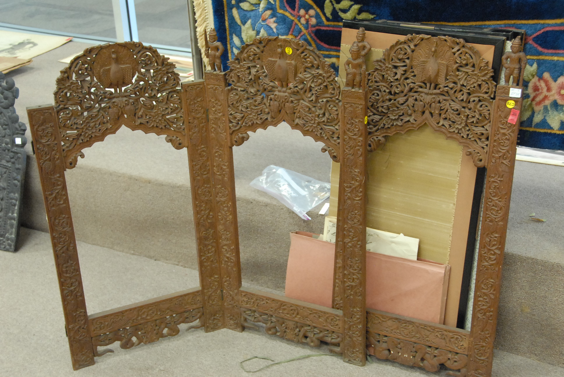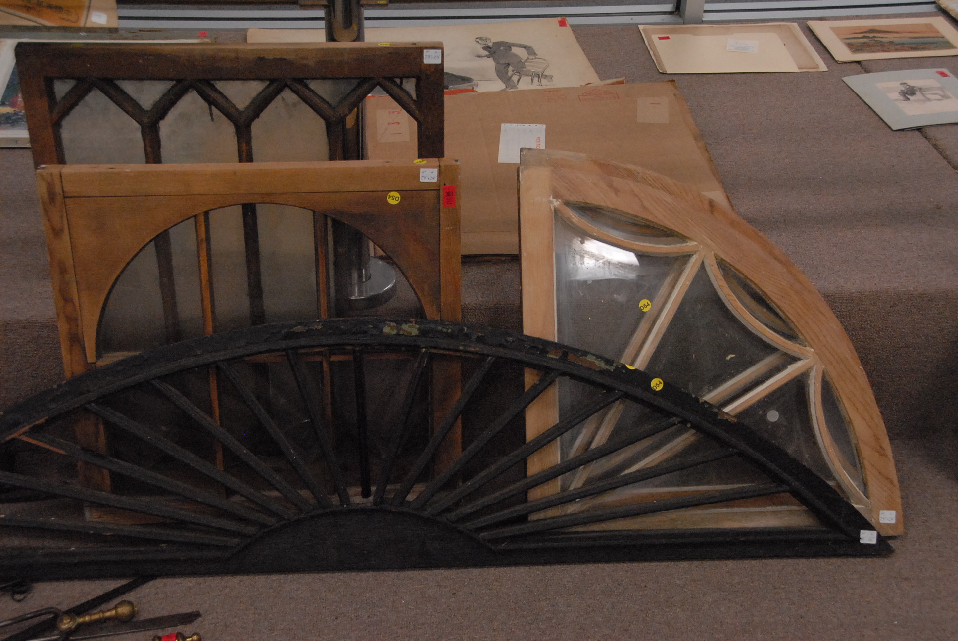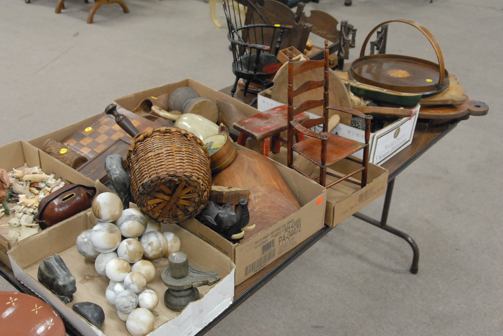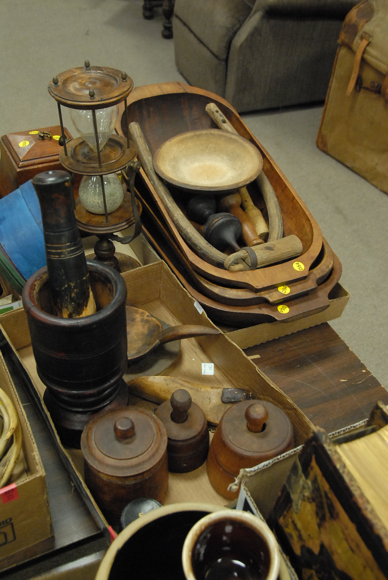 Three box lots of primitives including a mortar and pestle, butter molds, small round covered container, three oval bowls, a pantry box, hourglass, bone decorated Oriental plaque, and miscellaneous items