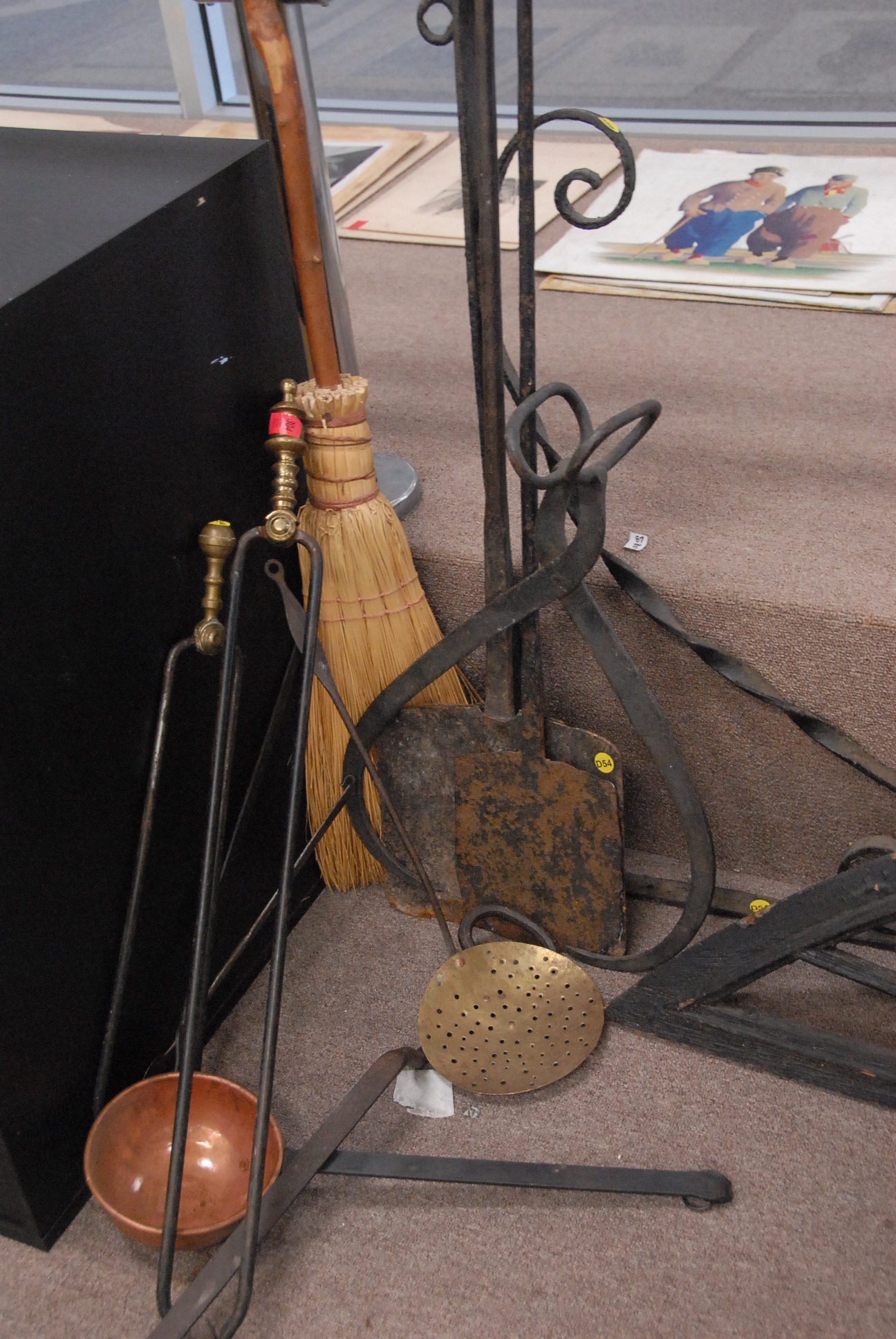 Group lot of iron and fire tools to include a fireplace crane, two peels, strainer, tongs with brass tops, forks, etc