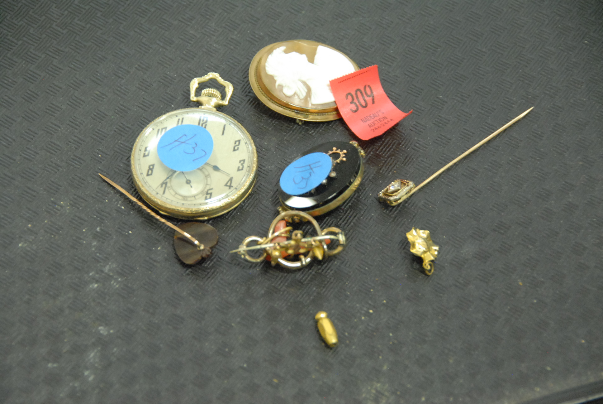 Group lot of Victorian jewelry and a pocket watch to include two hat pins, a cameo, coral pin, etc