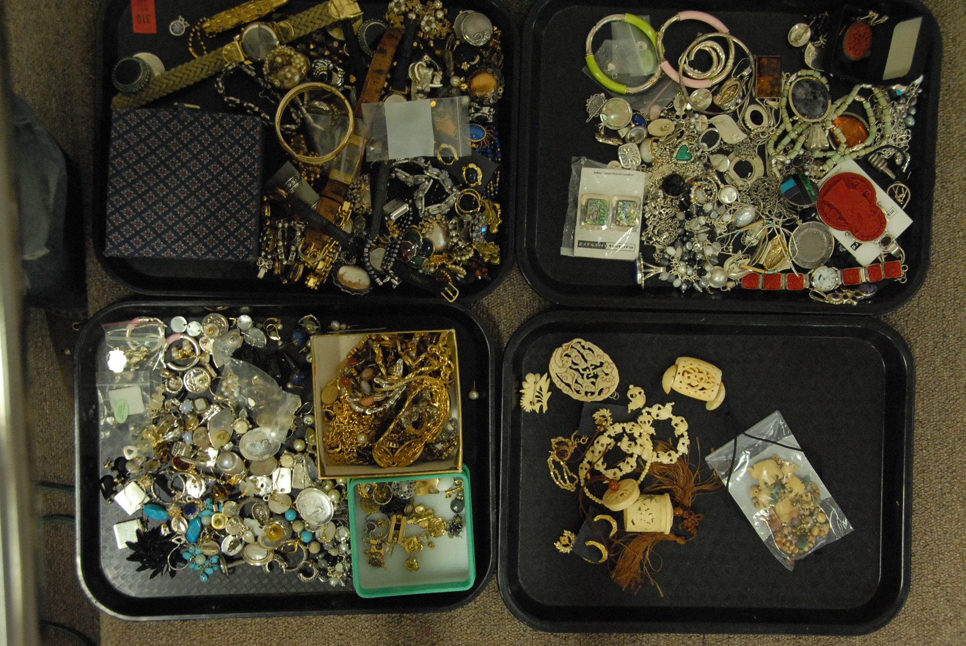 Four tray lots of various jewelry including sterling silver, earrings, bracelets, wristwatches, ivory, and misc