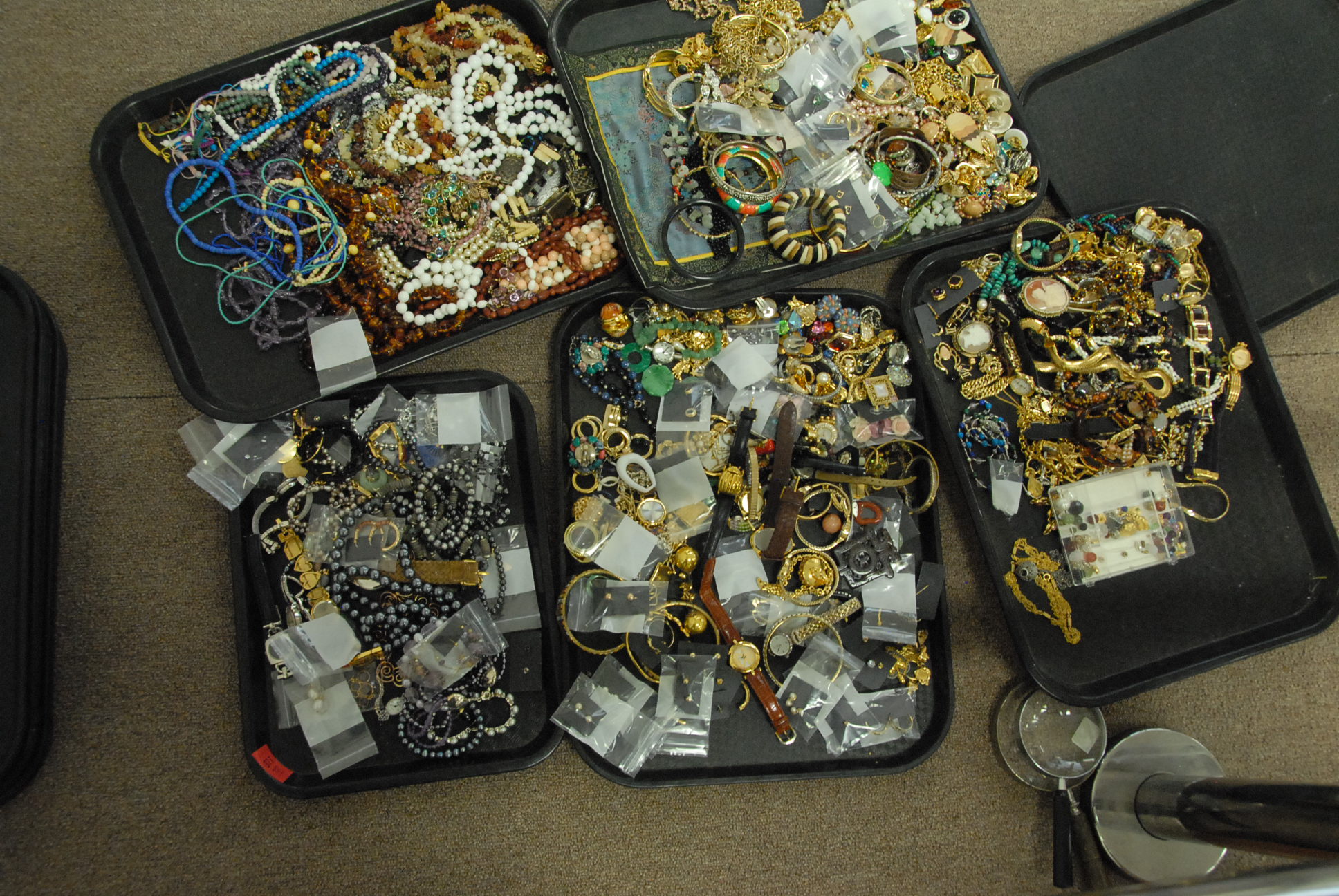 Five tray lots of various costume jewelry to include earrings, bracelets, chains, necklaces, and watches