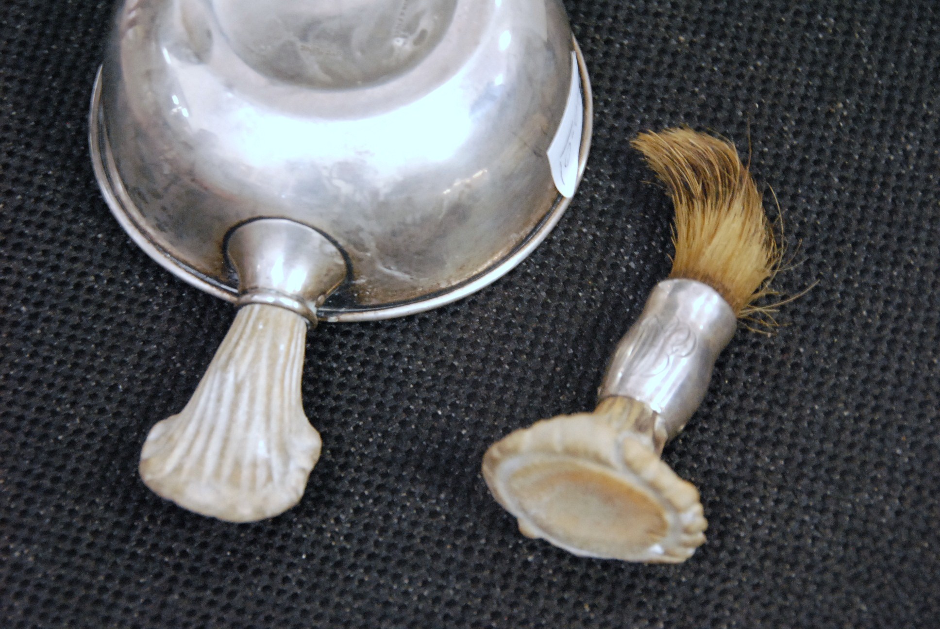 Small porringer with a stag handle along with a sterling shaving cream brush with a sterling and stag handle