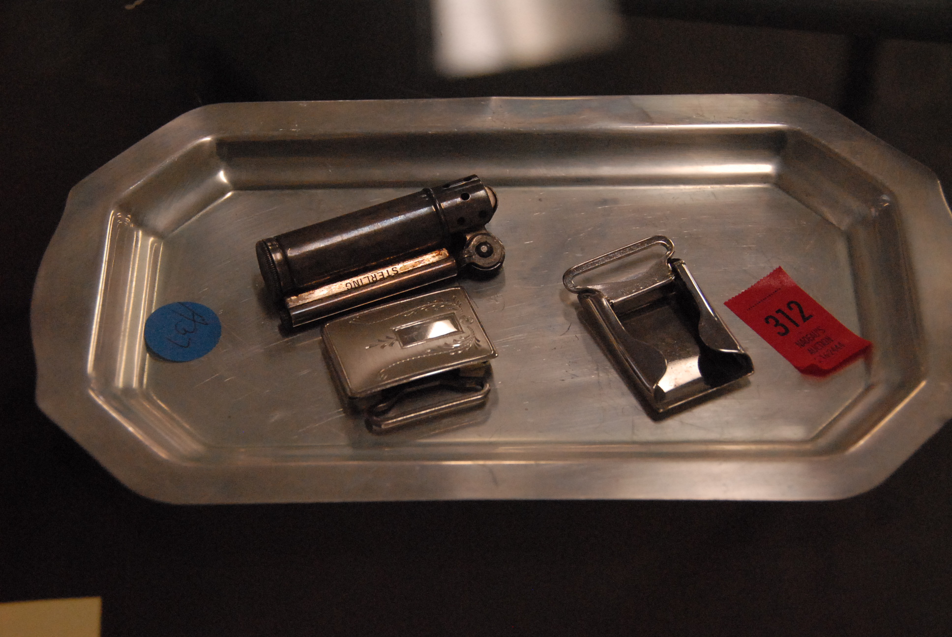 Sterling silver lot to include two buckles, sterling cigarette lighter, and a small tray