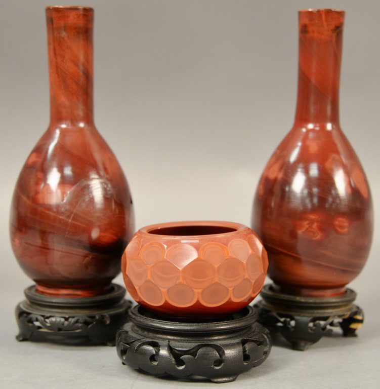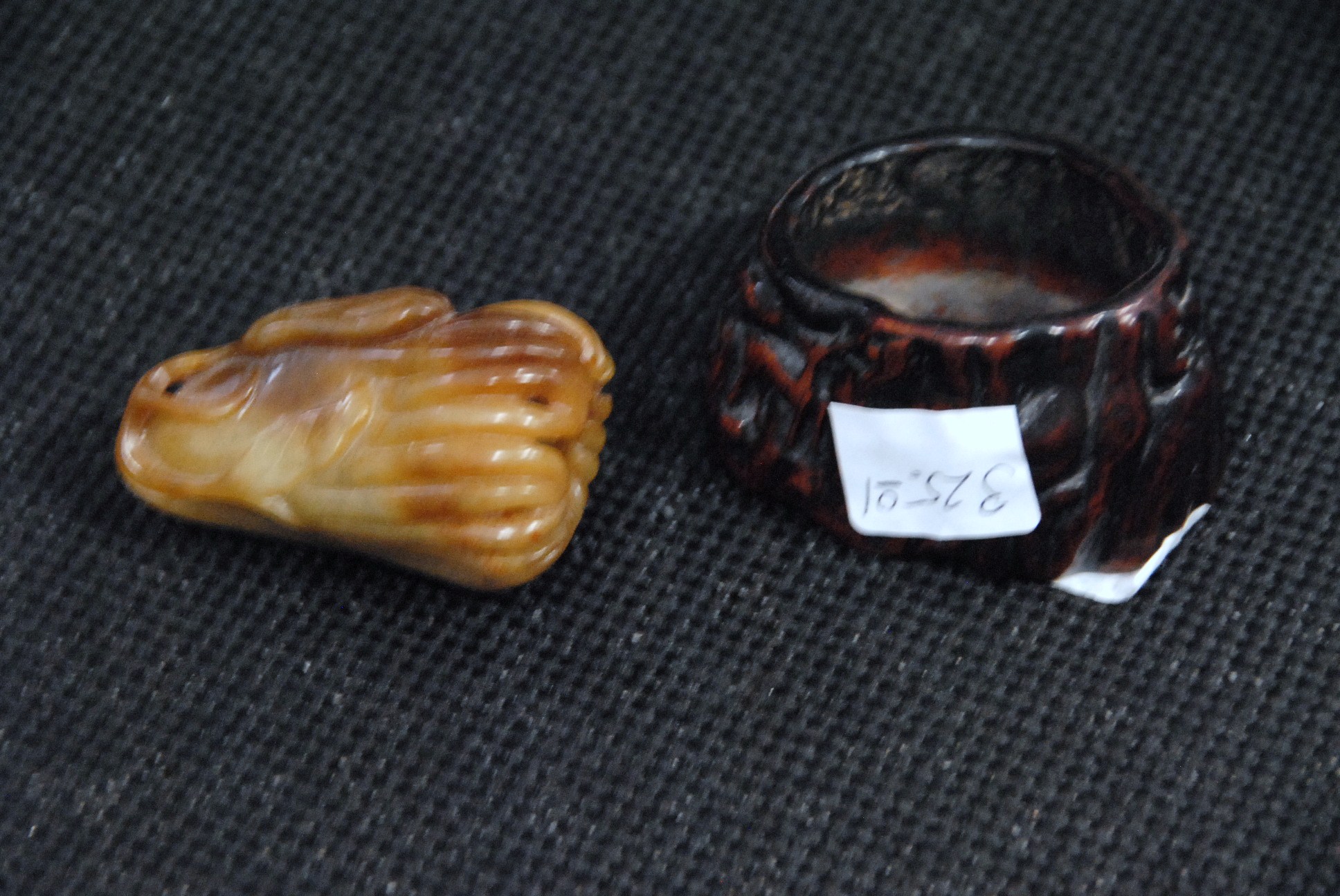 Small Oriental soapstone ink cup along with a small bamboo brush pot.