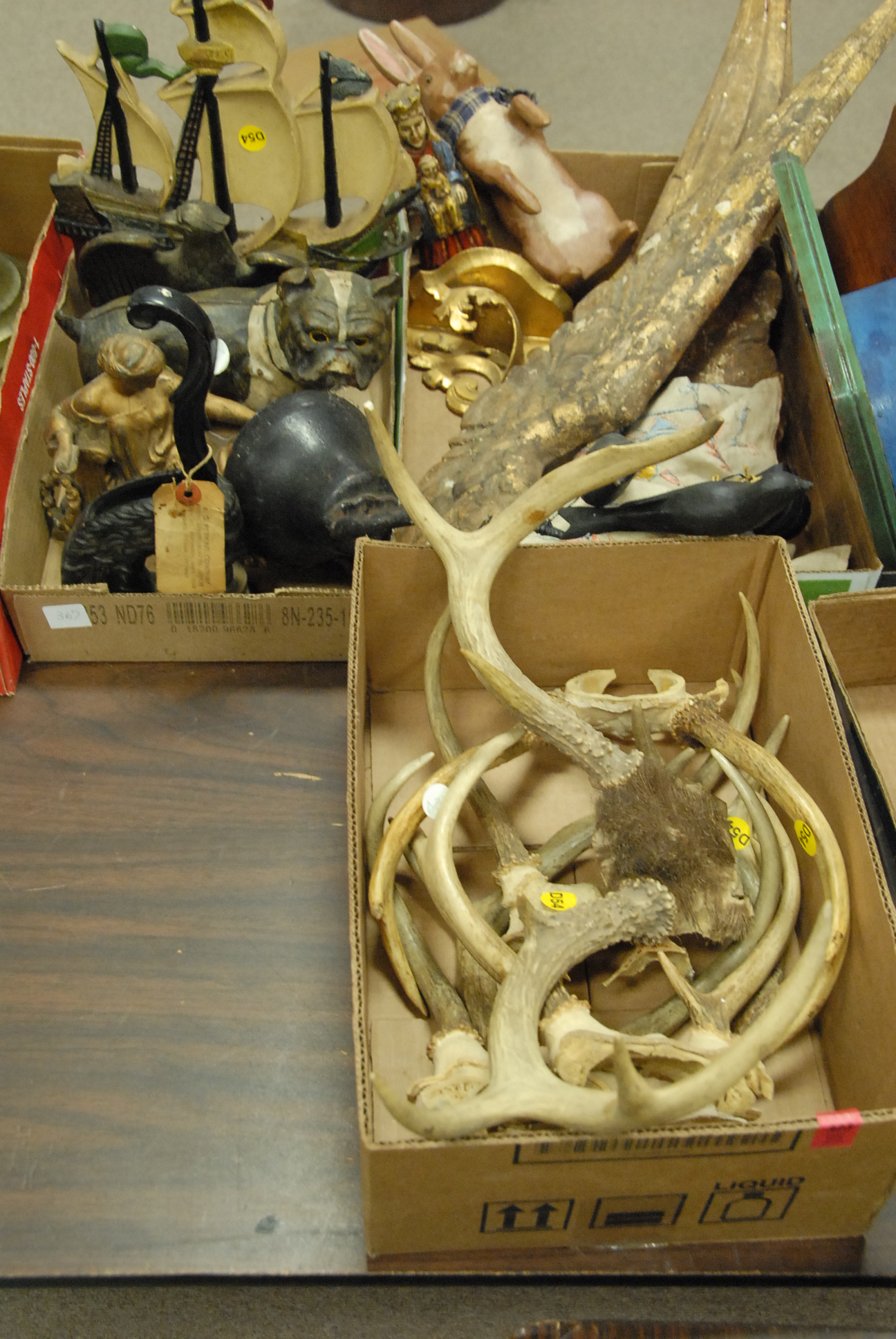 Group of three box lots to include antlers, small bird figures, a pair of wings, a pair of small shelves, a bulldog doorstop, a ship doorstop, etc