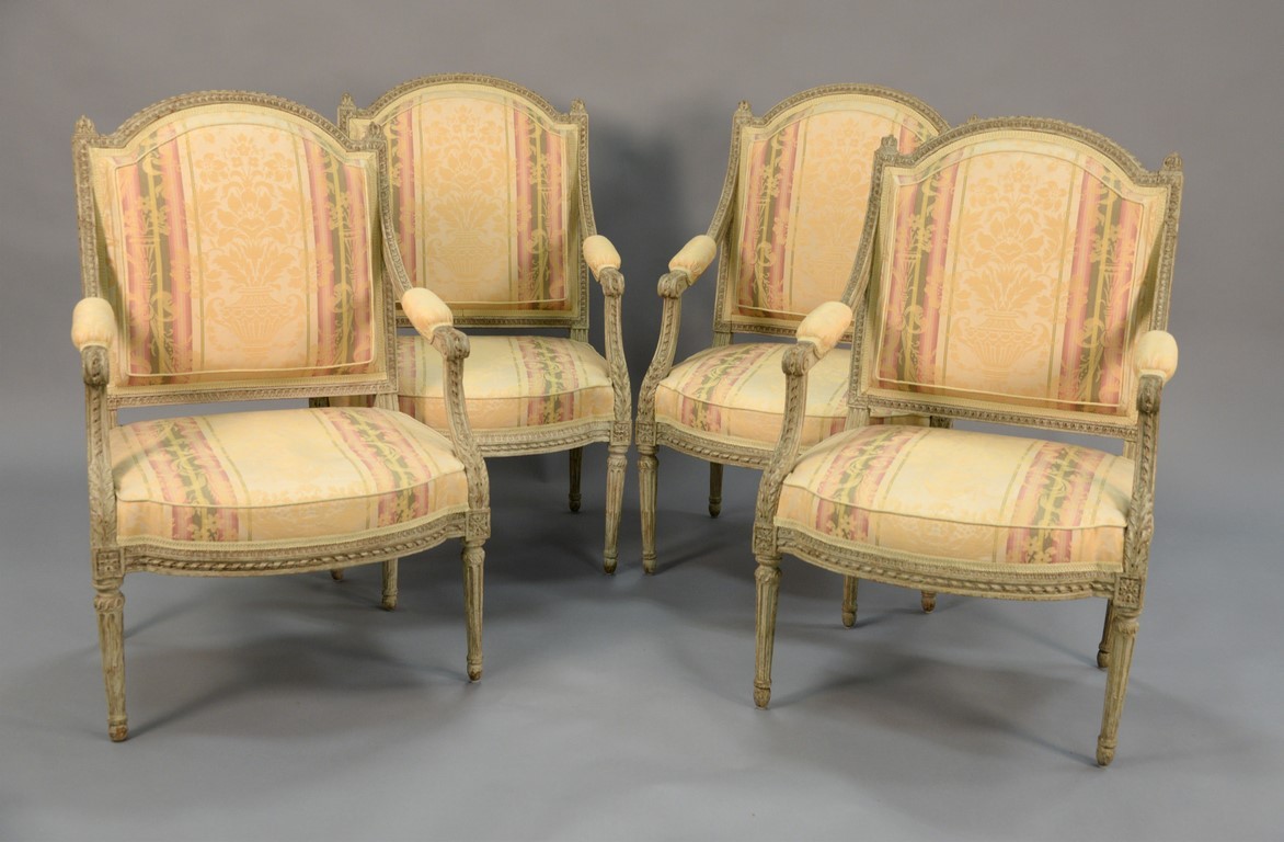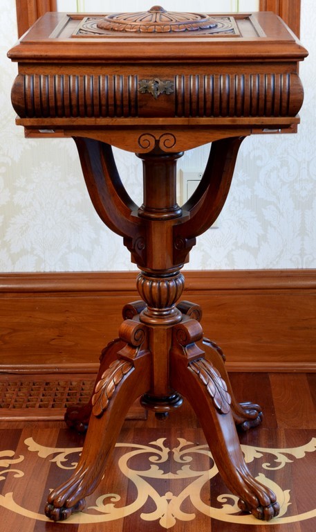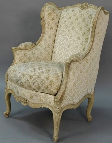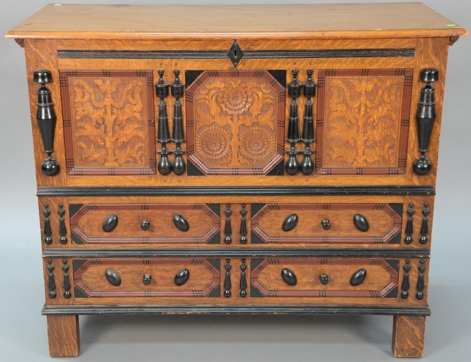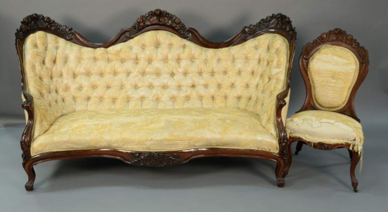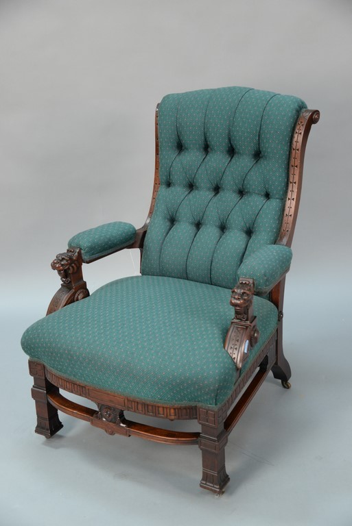 Five piece lot including an oak carved armchair, two rockers, an empire chair, and an iron plant stand.