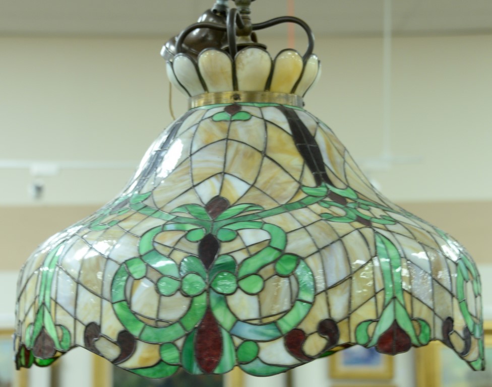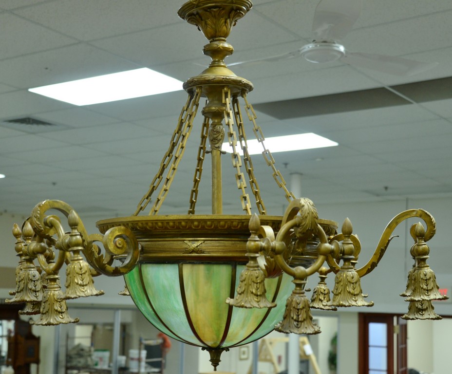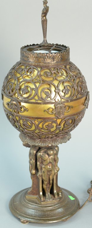 Three arts and crafts metal lamps, one floor lamp, two table lamps.
