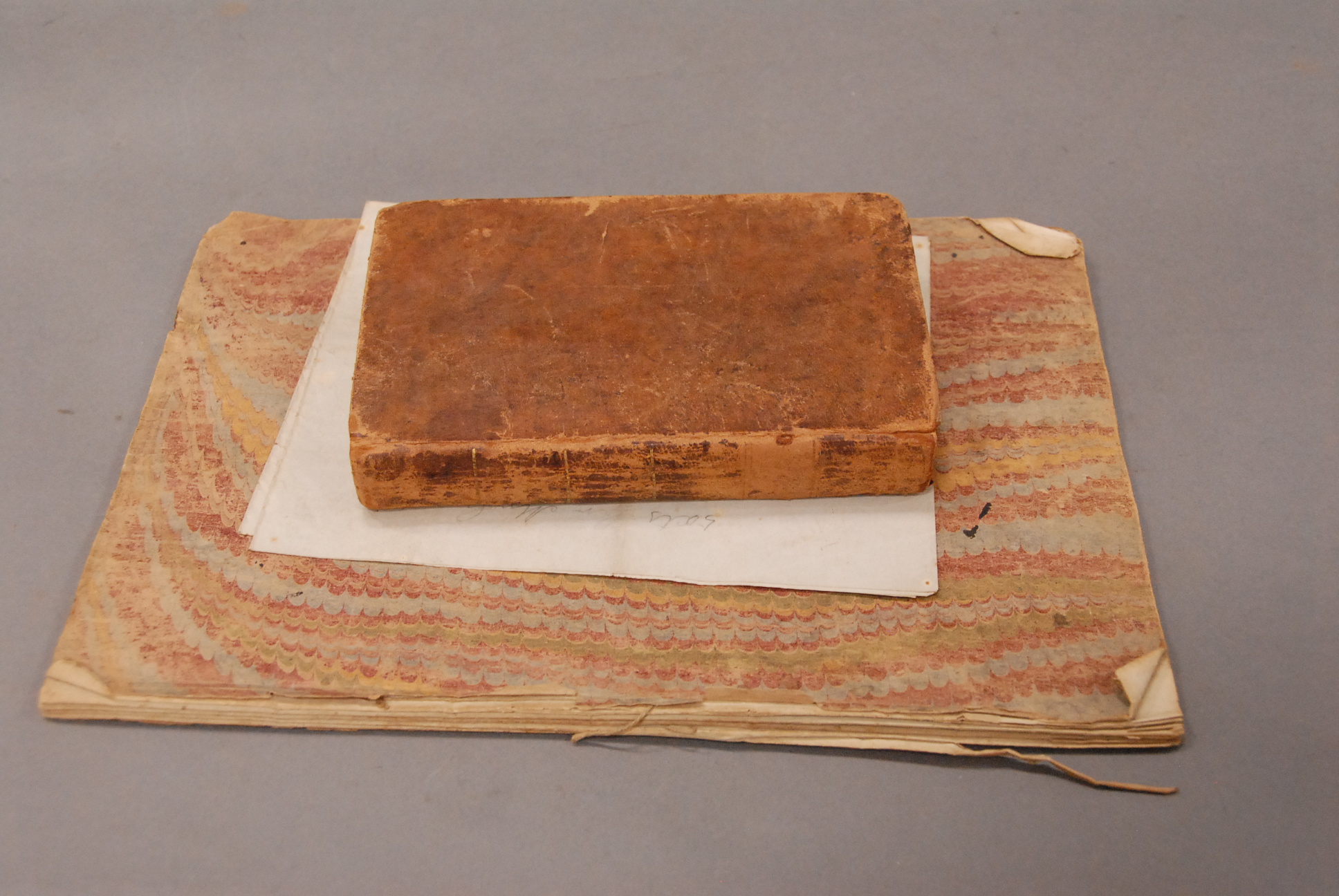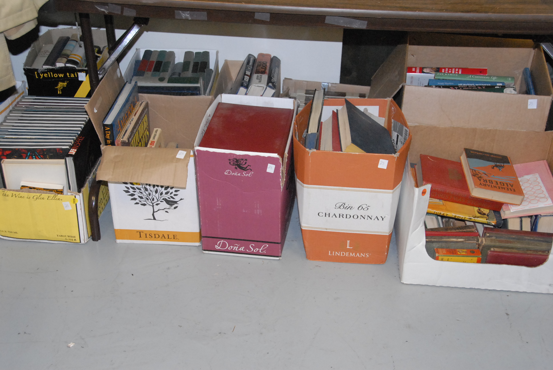 Two table lots including three boxes of books, vintage clothing, lamps, kitchenware, pocket books, pots and pans, china, glassware, and miscellaneous items.