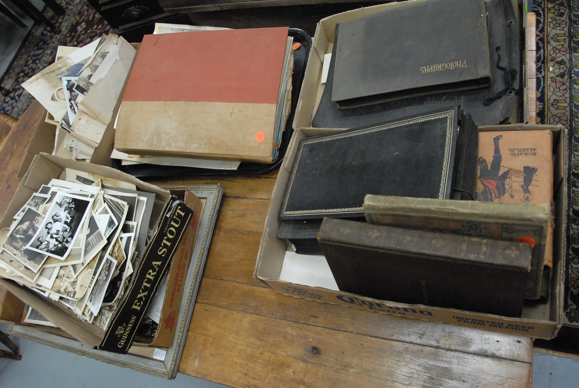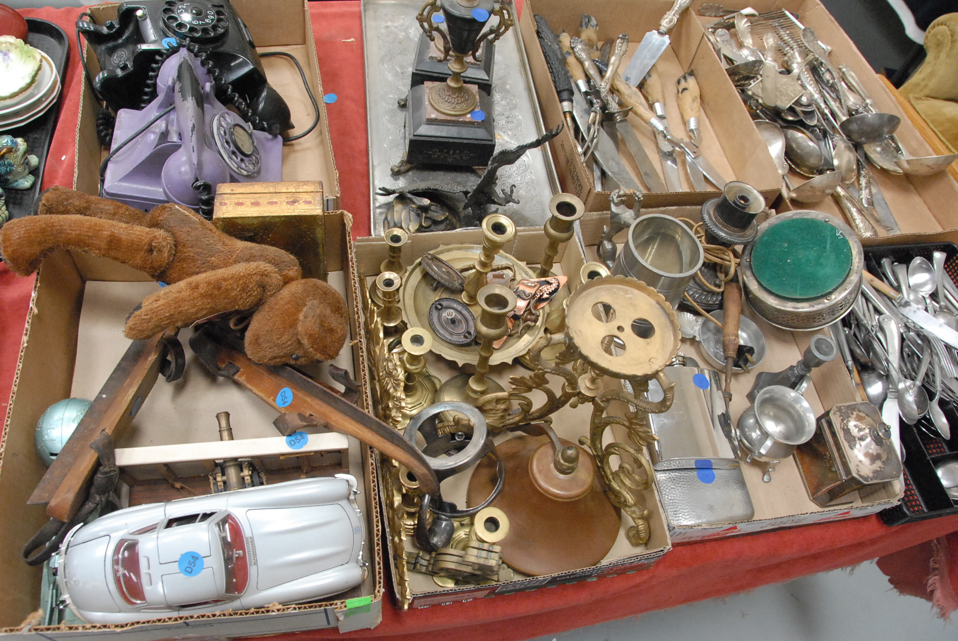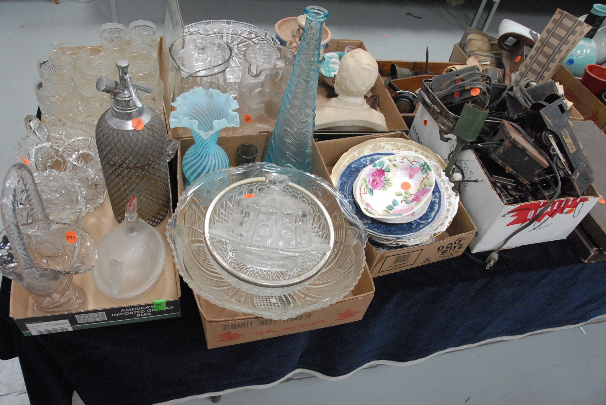 Eight box lots including glassware, vases, bowls, pressed glass, china, toy train parts and tracks, stereo viewer with views, and silver plated flatware.