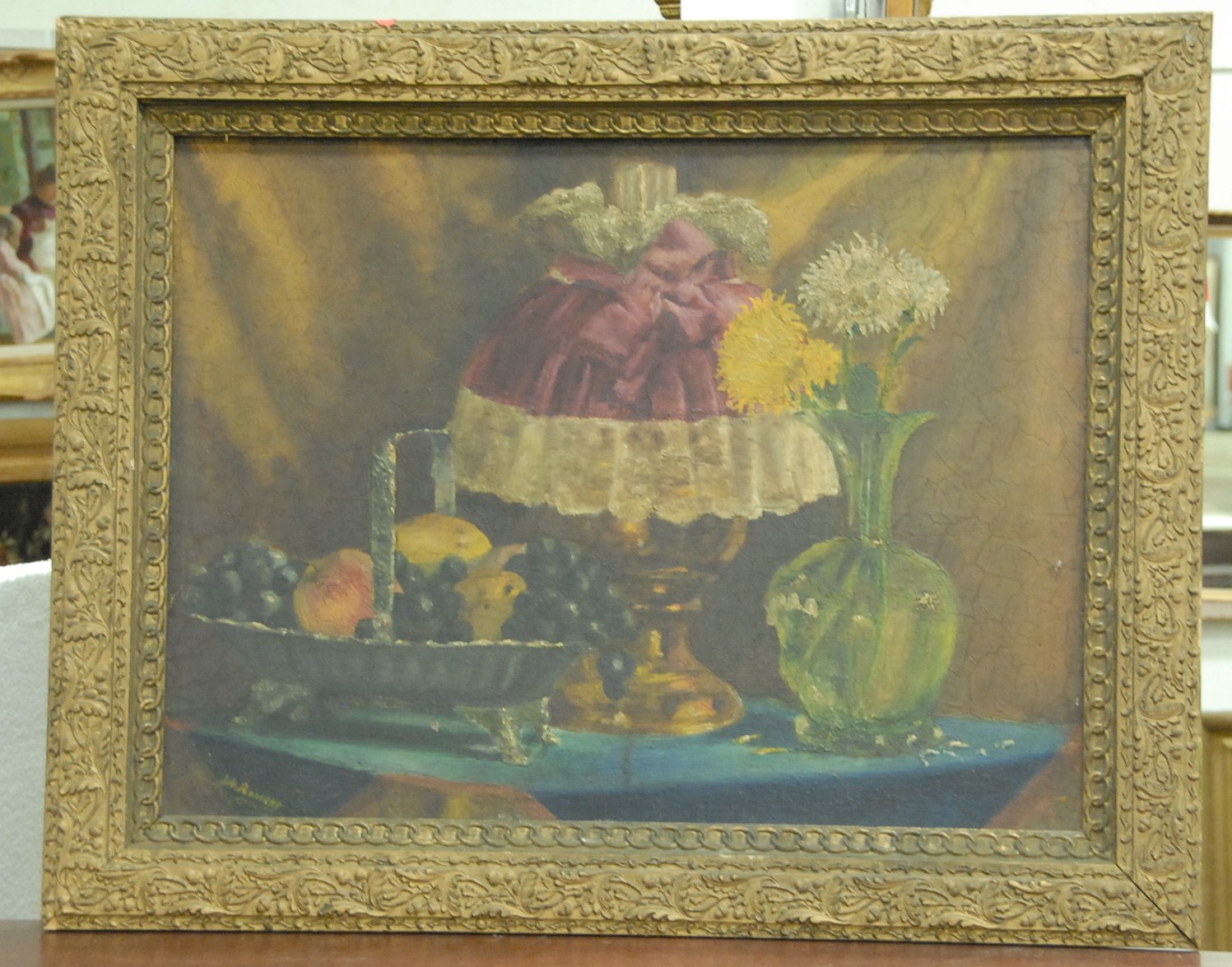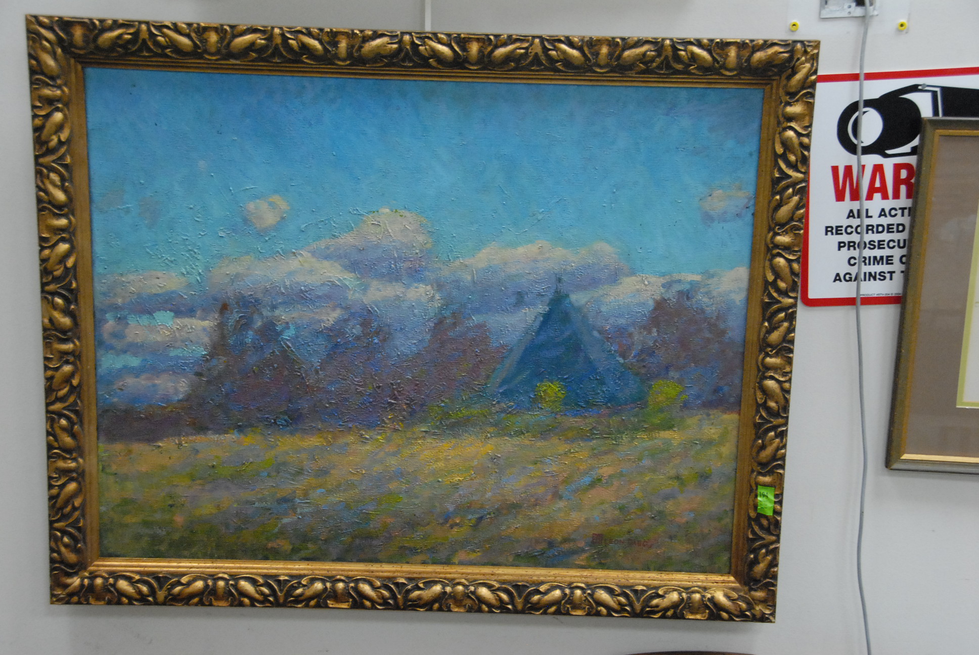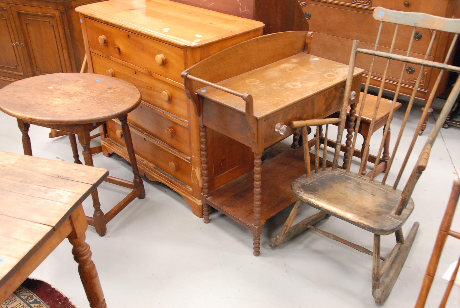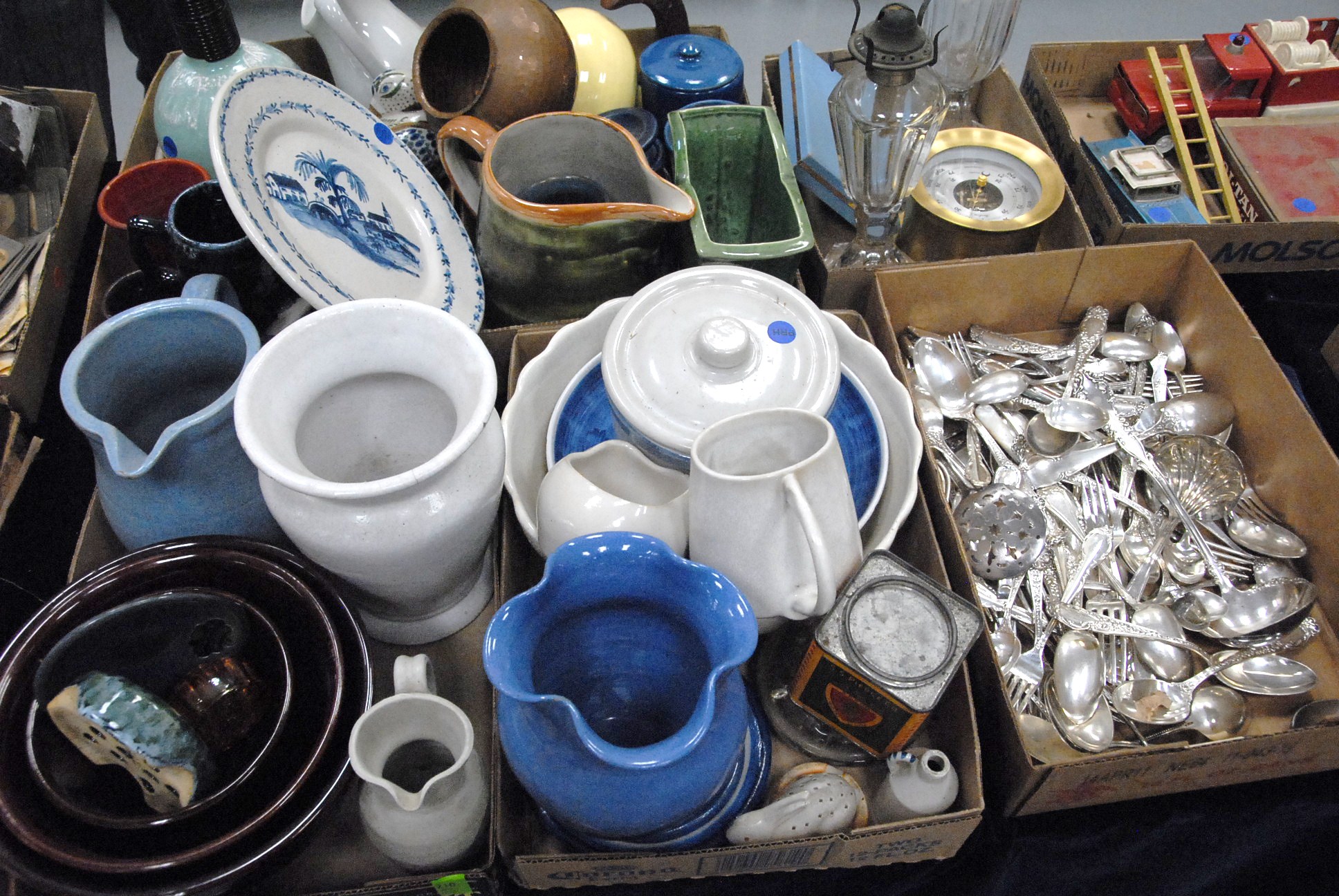 Seven box lots including mostly pottery, including arts and crafts, Sioux Indian saucer, North State pottery, pitchers, silver plated flatware, barometer, vases, Bainton plates, and more.