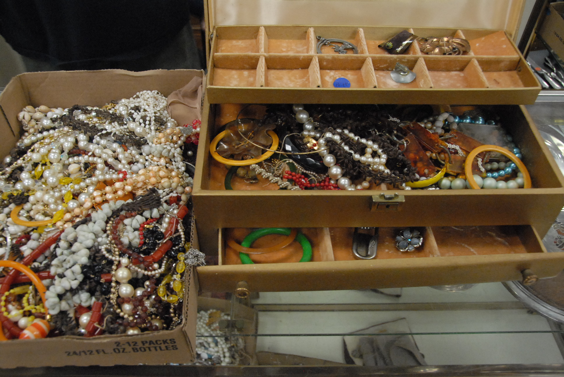 Three tray lots and a jewelry box of costume jewelry, jack knife, pins, necklaces, and miscellaneous.