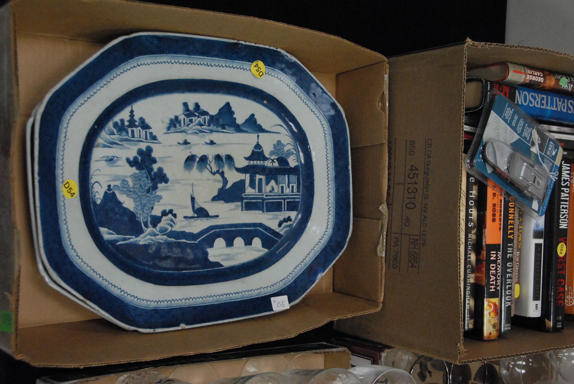 Lot to include a map of Africa, a box of books, and two Canton platters, both as is.