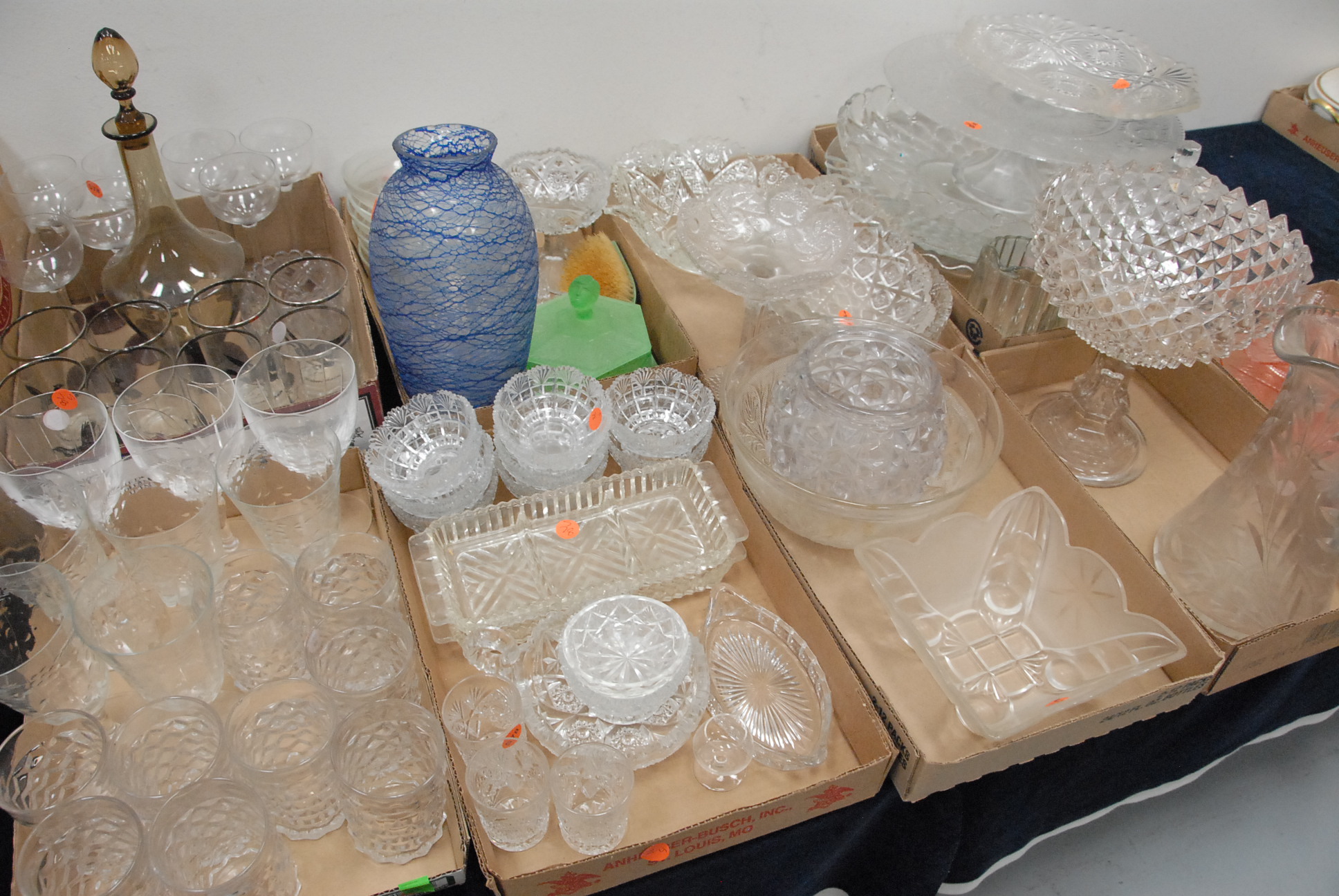 Nine box lots of glassware, pressed glass, depression glass, crystal, and miscellaneous.