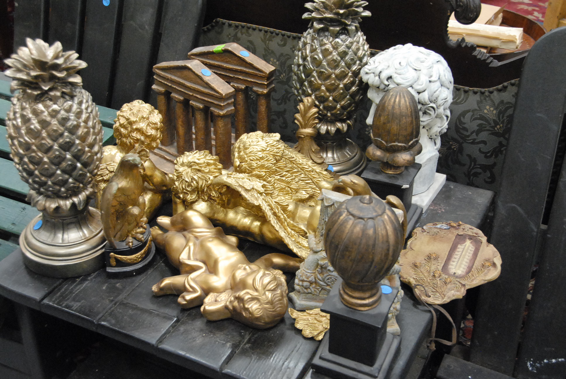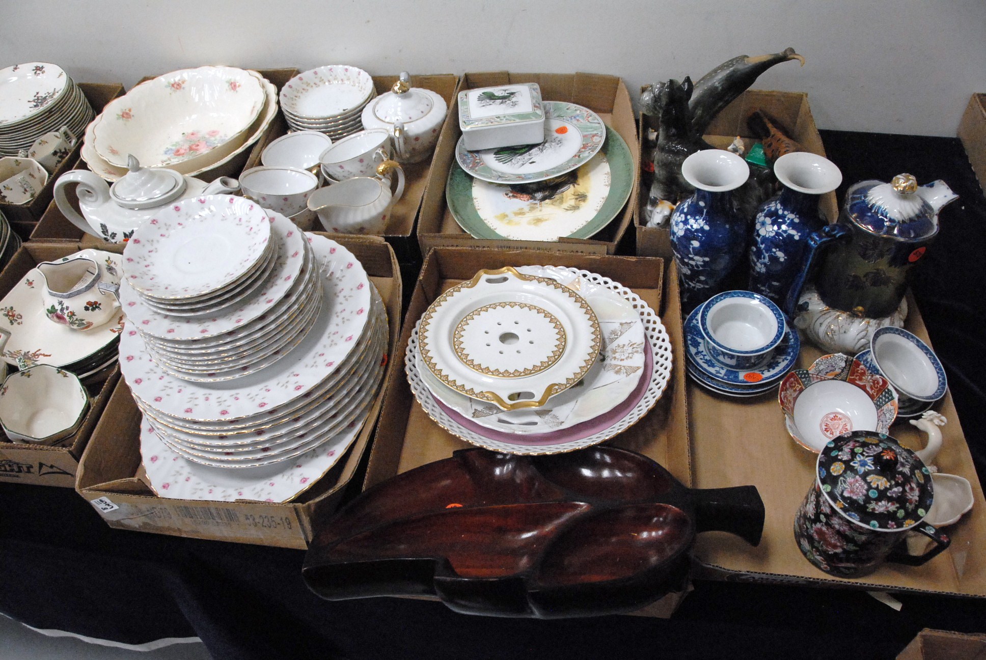 Fifteen box lots of china, dinnerware, blue Oriental vases, teapot, animal figures, and miscellaneous.