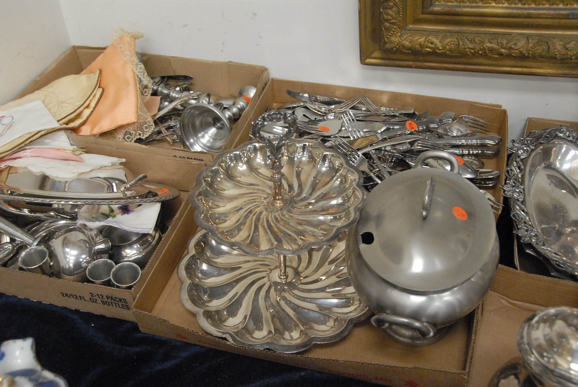 Seven box lots of mostly silver plate, brass, and miscellaneous.