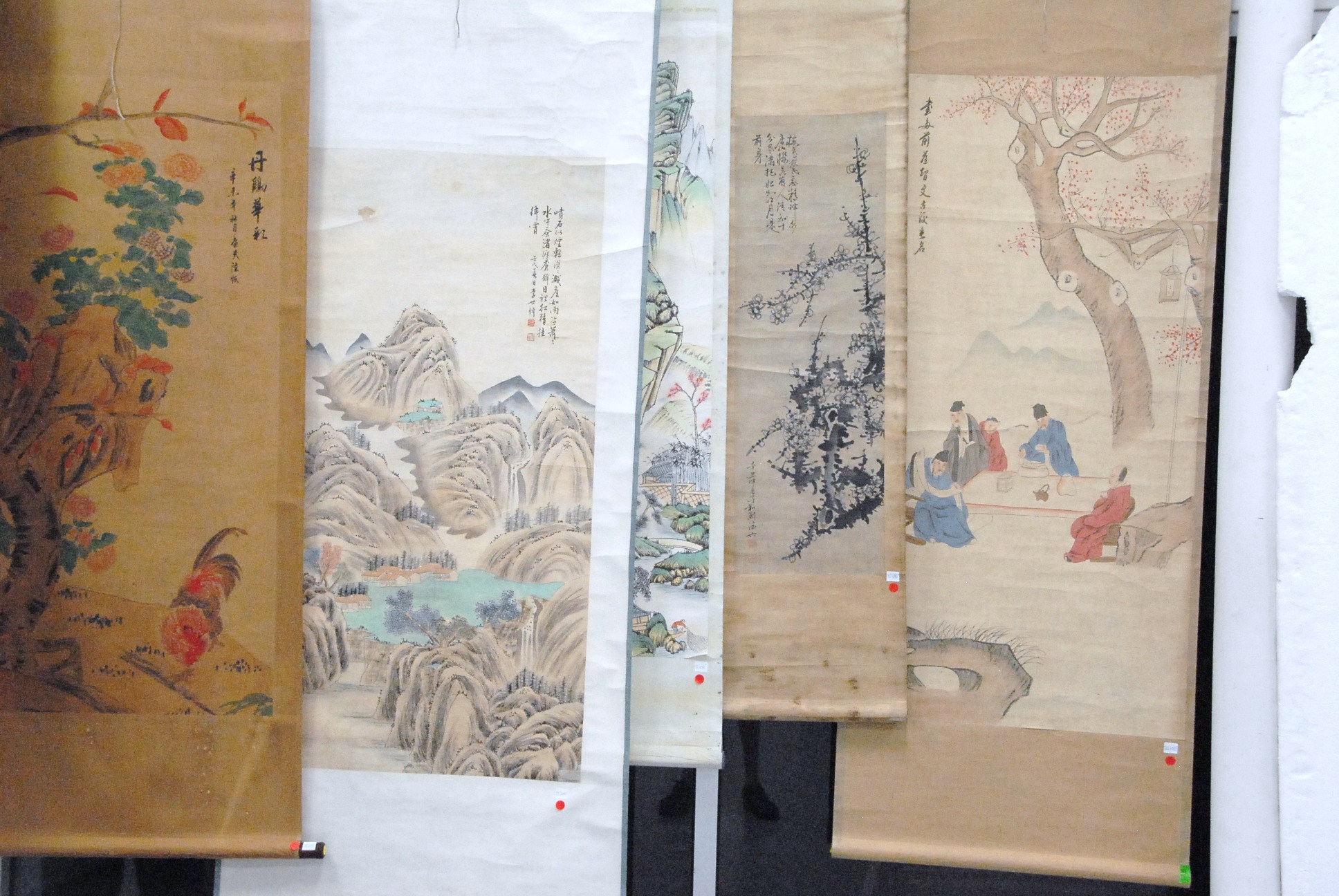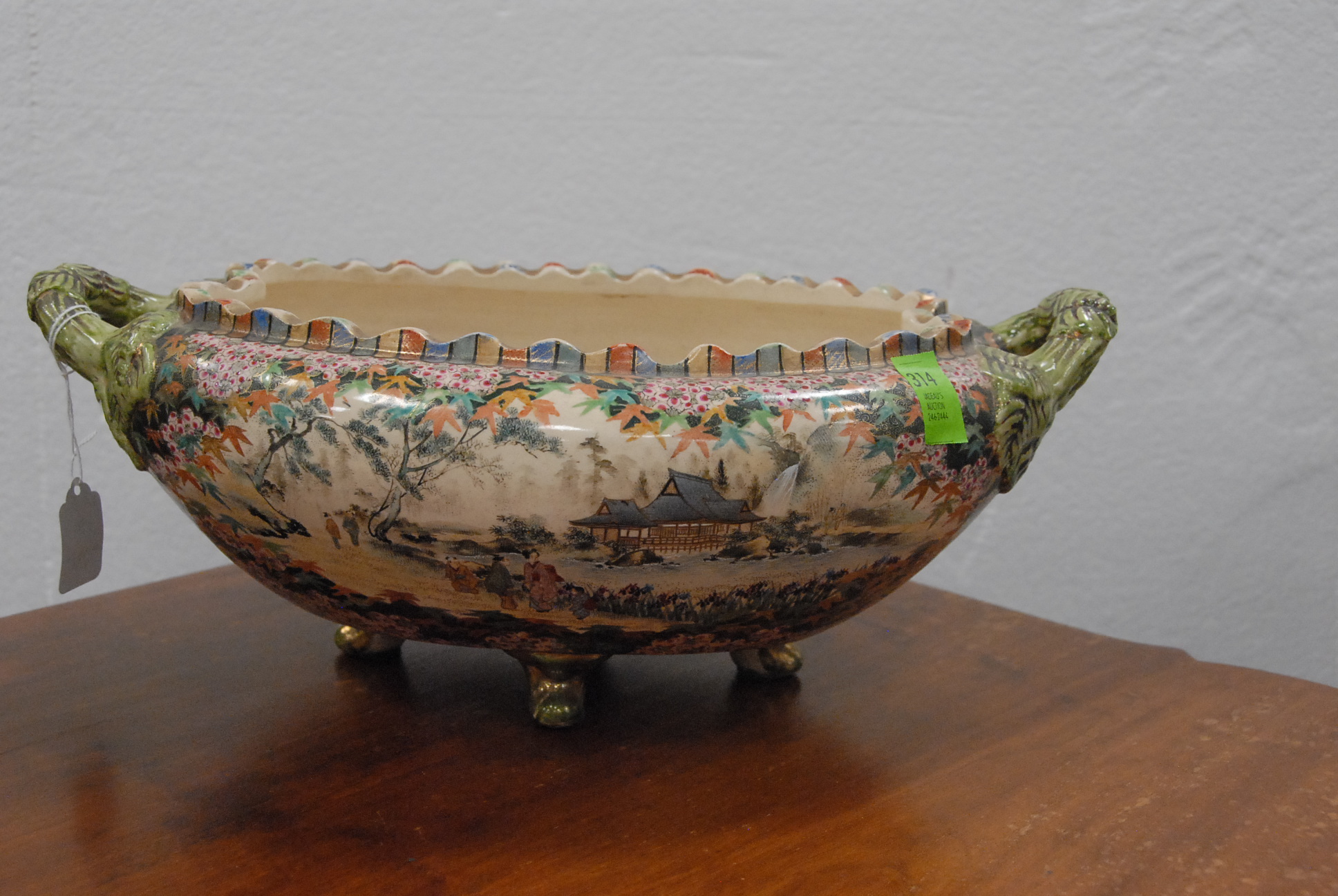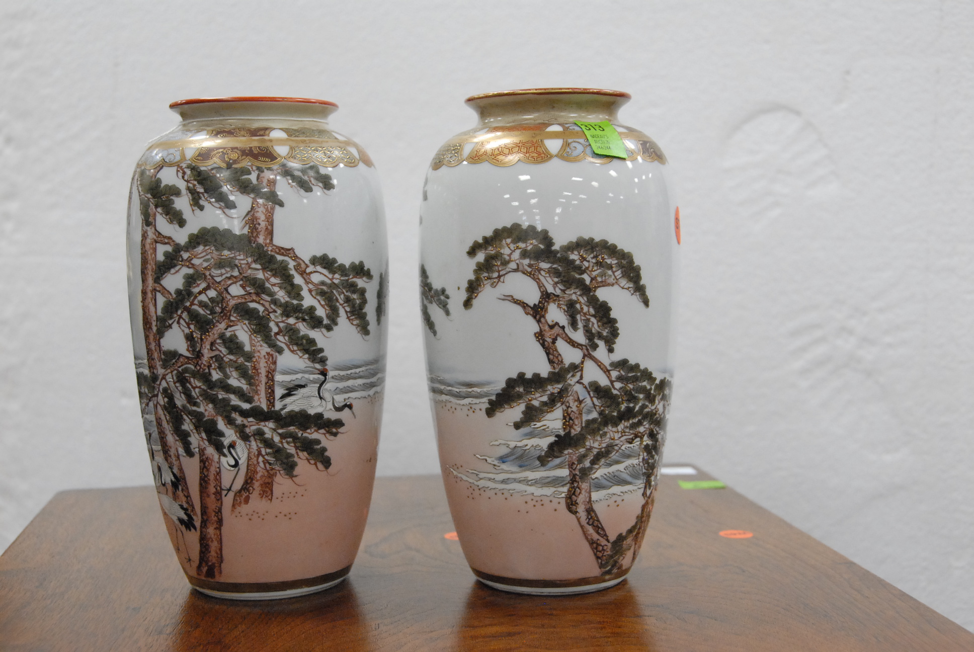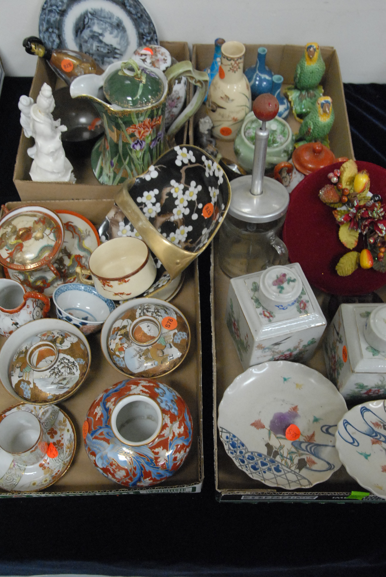 Four box lots of china including two Chinese tea caddy’s, two Japanese plates, Japanese and Chinese dishes, and small vases, pair of majolica parrots.