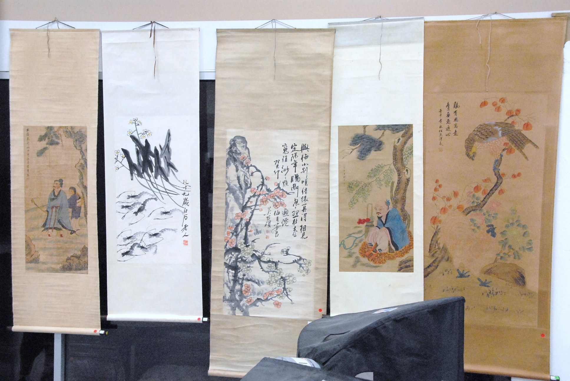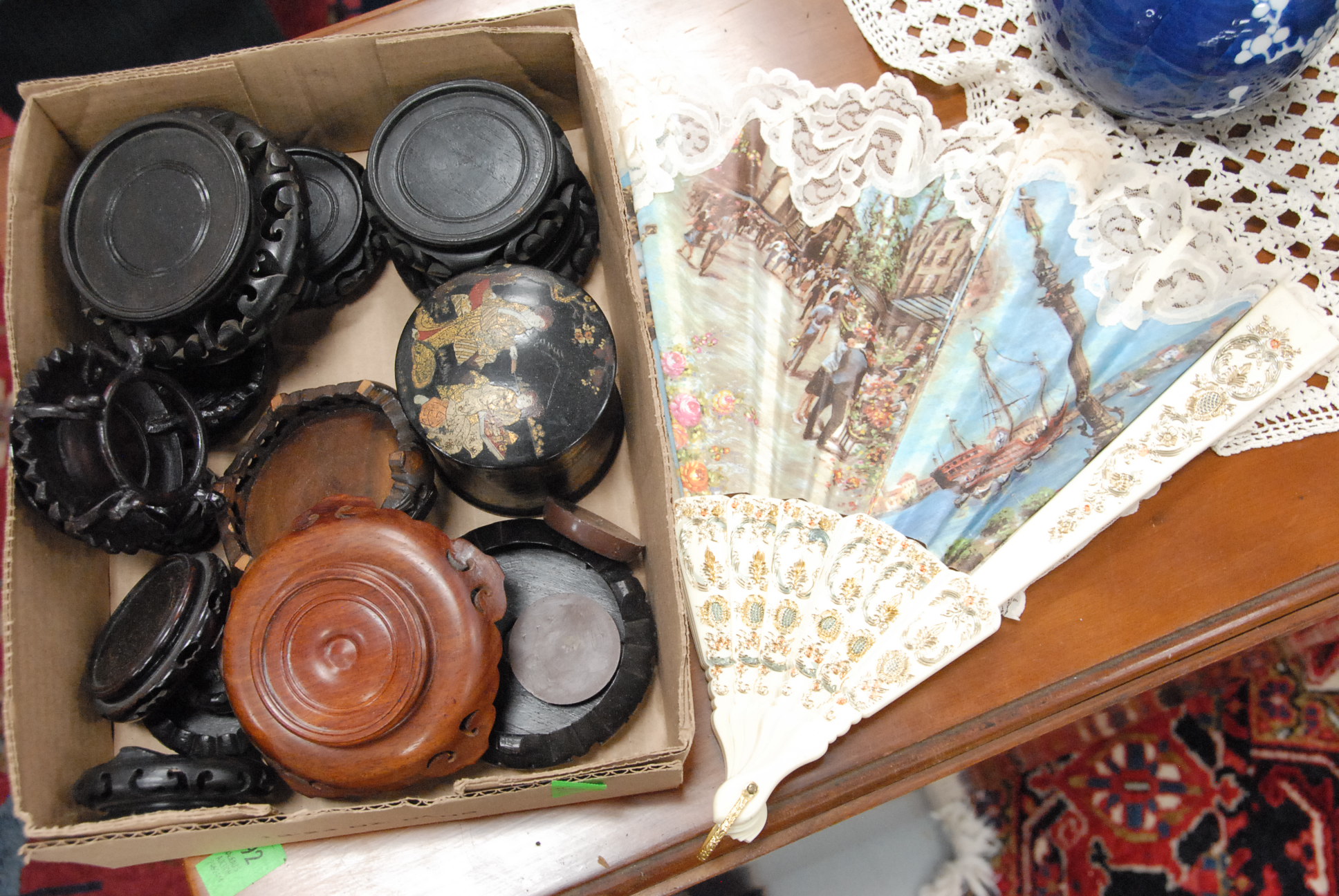 Box of Oriental stands and an Oriental fan, along with a covered round box.