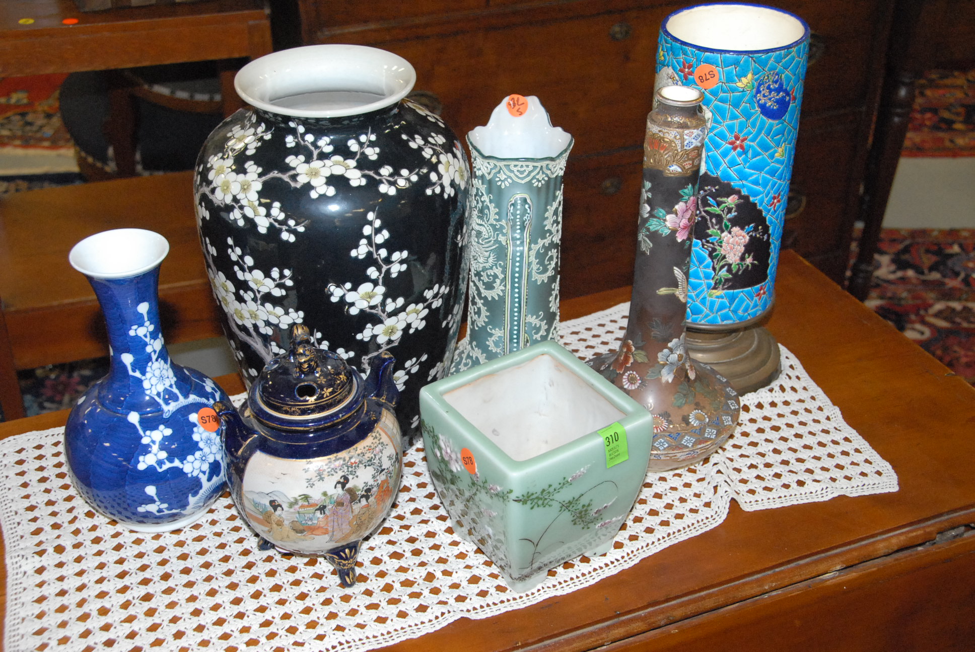 Six piece lot of Japanese porcelain to include vases, incense burner, and a pitcher.