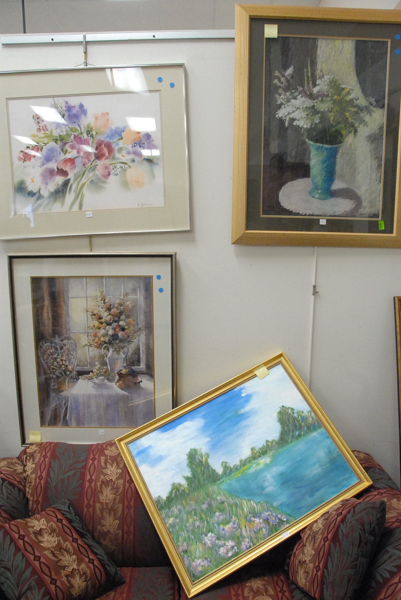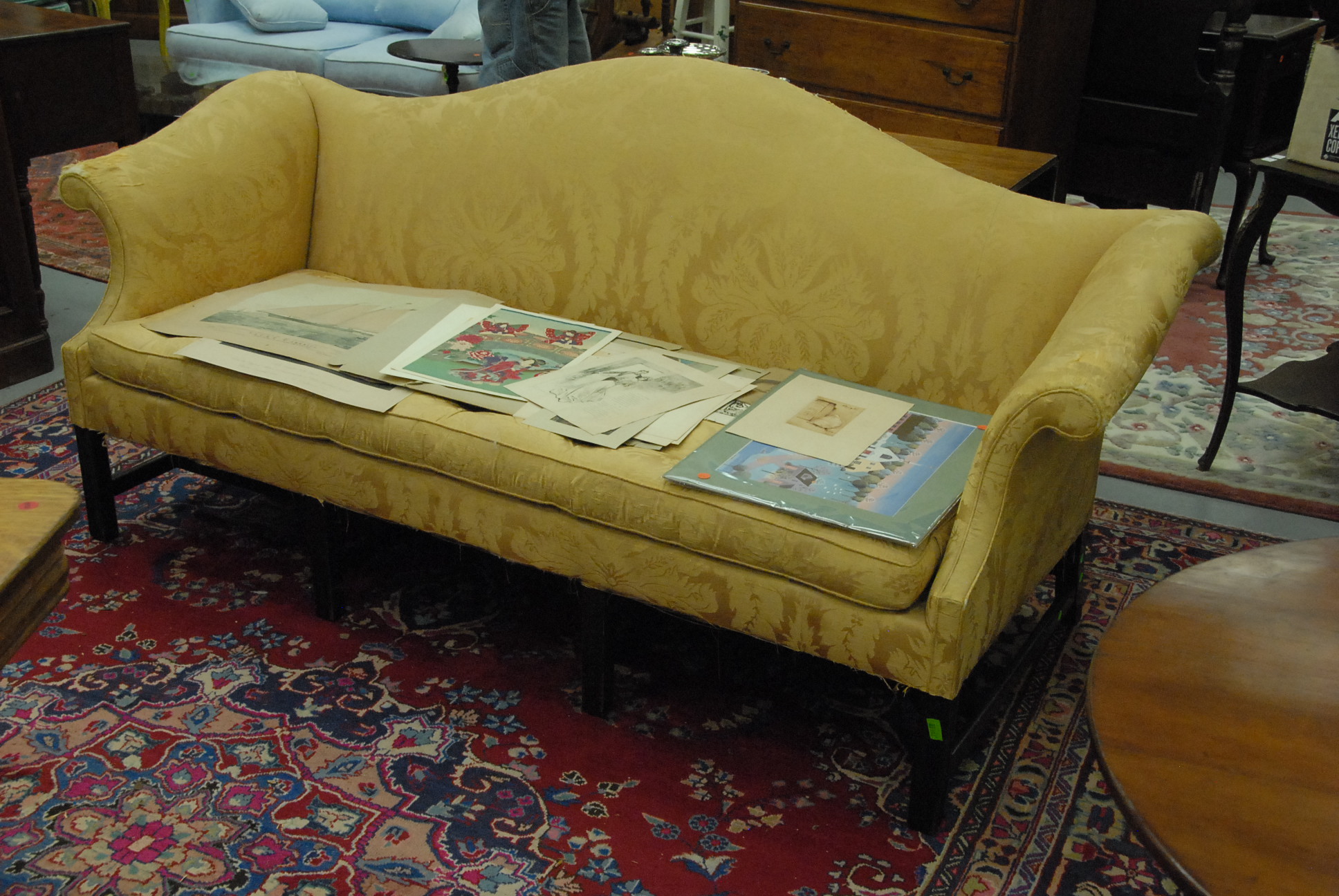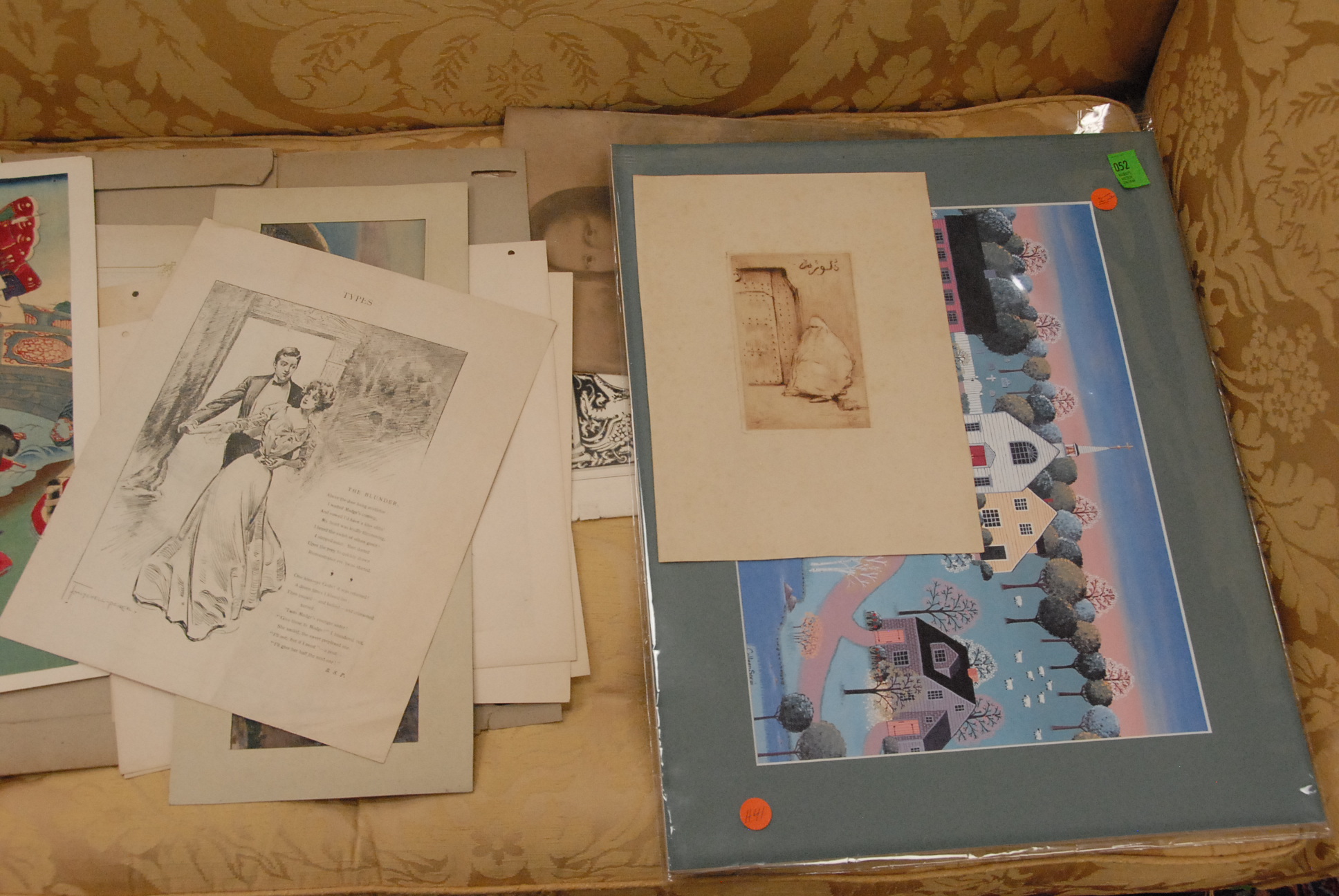 Large grouping of prints including two Japanese woodblock prints, print of Yacht America 1851, 18th century prints including Henry Camille, Andre Hercules, Clement the 9th, and a drawing signed Kate Rogers Newell.