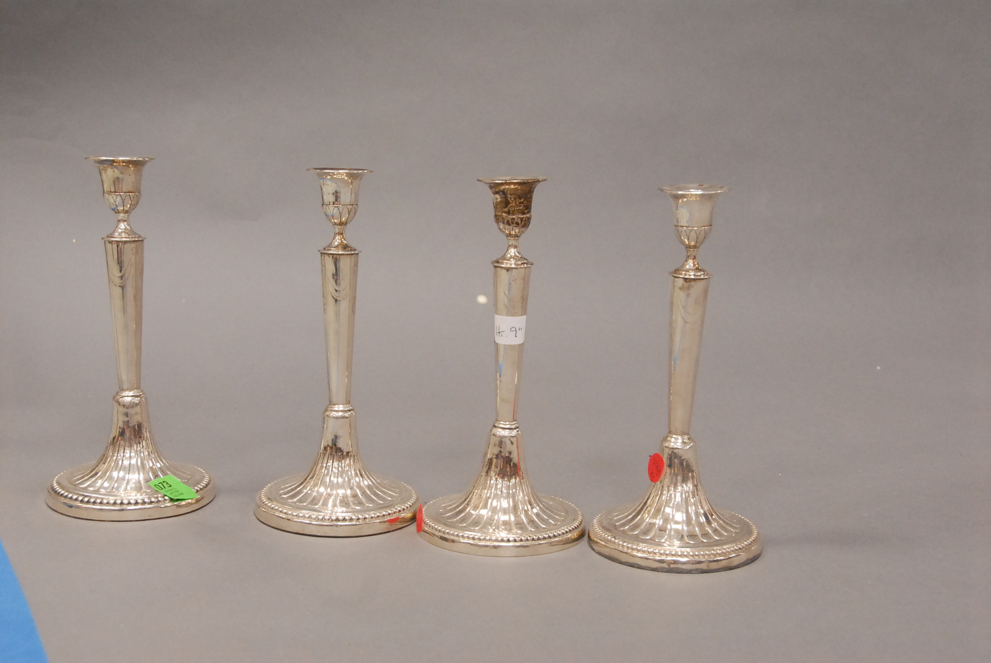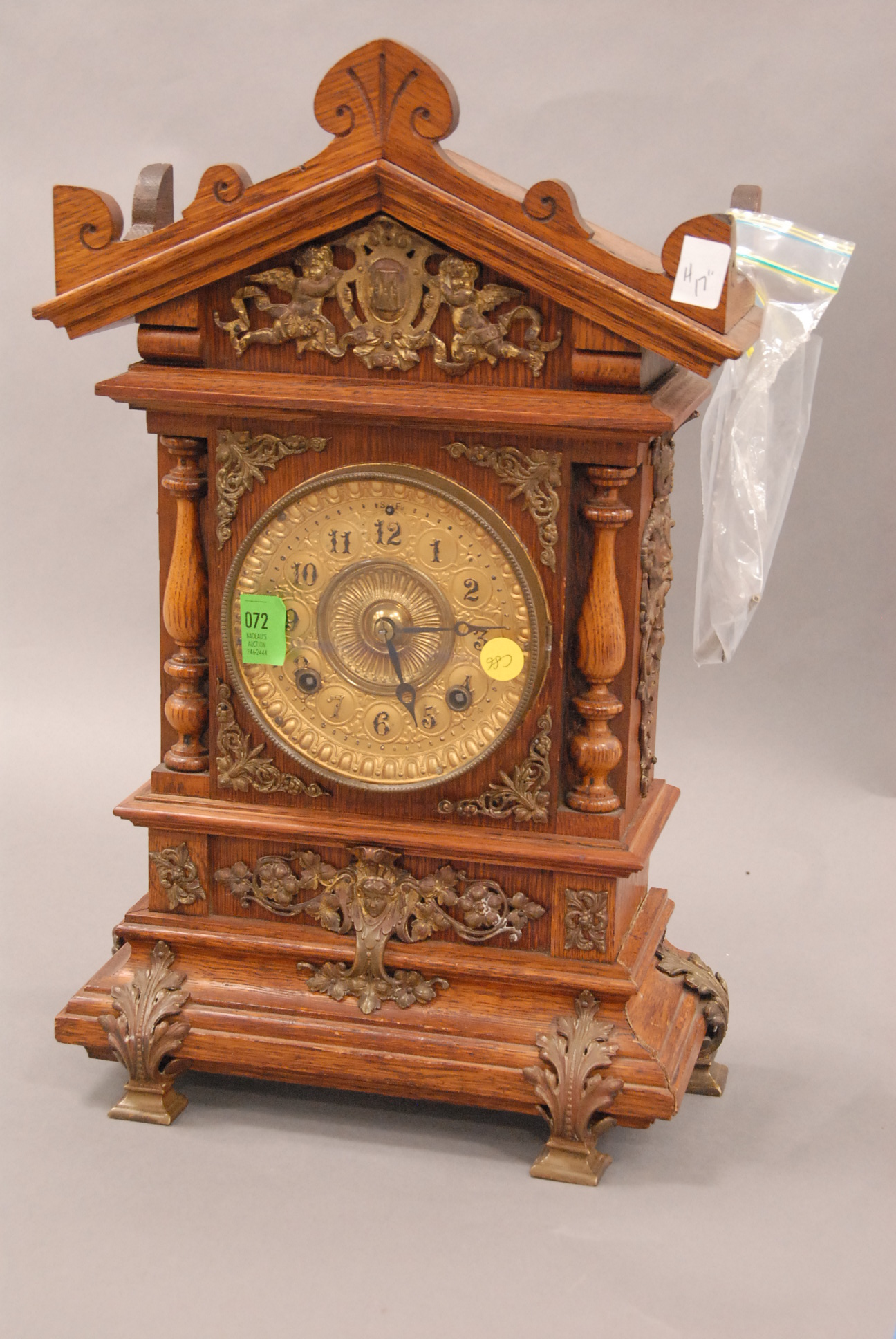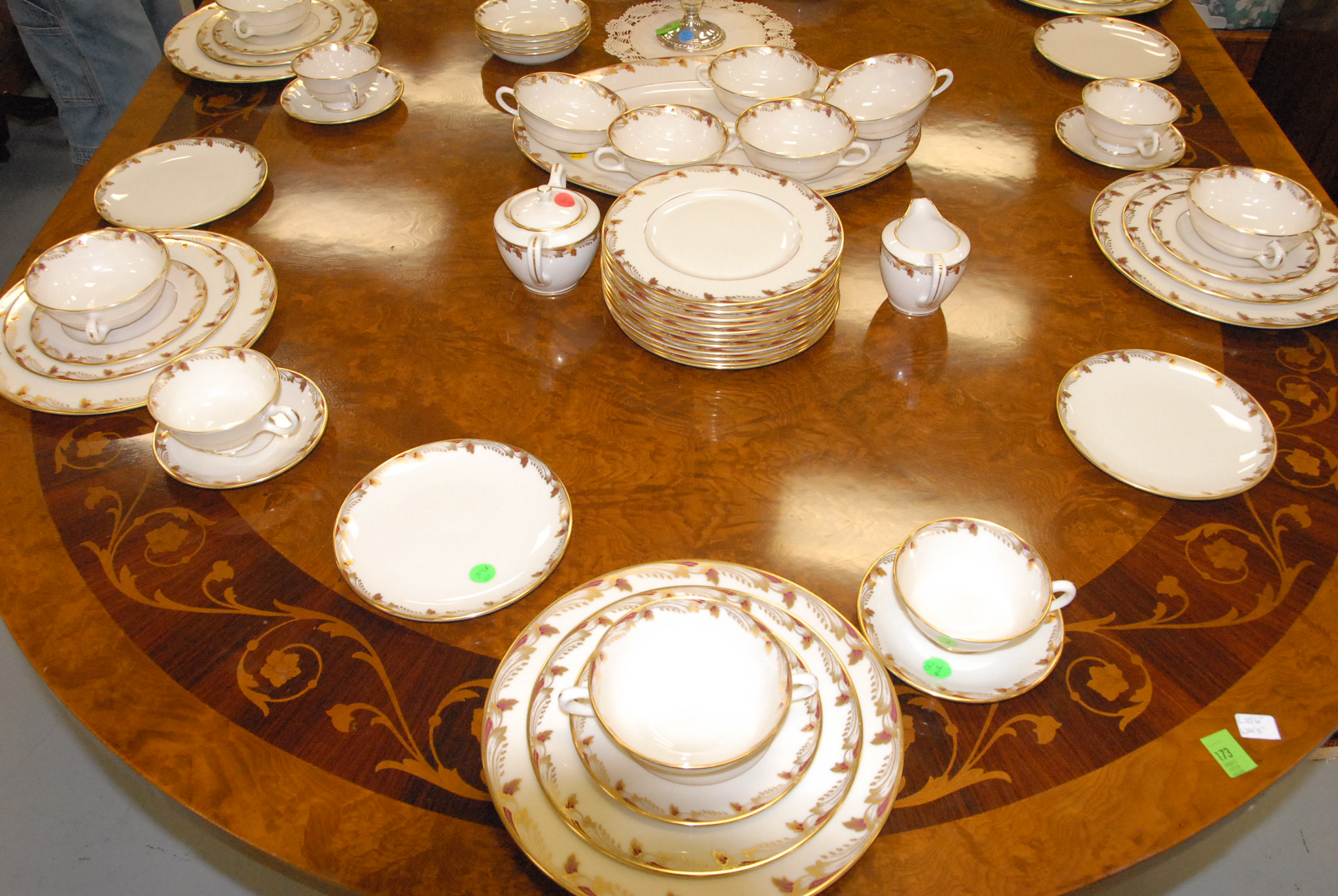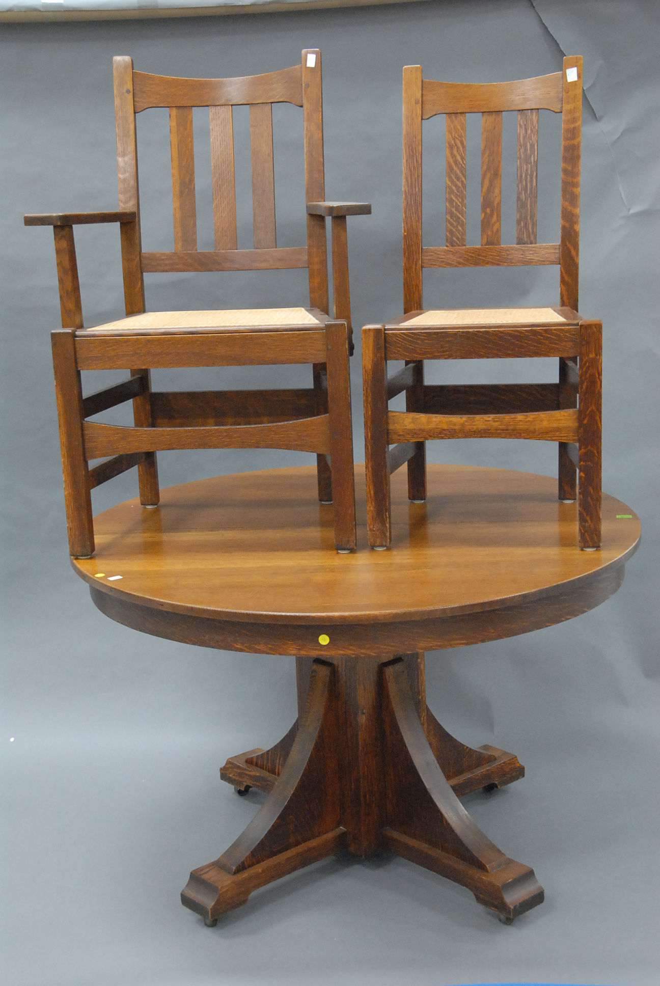 Mission oak round dining table and six chairs with caned seats with metal labels marked Quaint Furniture, Stickley Brothers Company, Grand Rapids, Michigan, two leaves and custom pads.