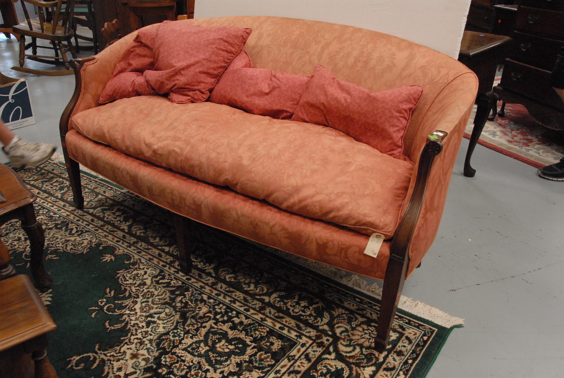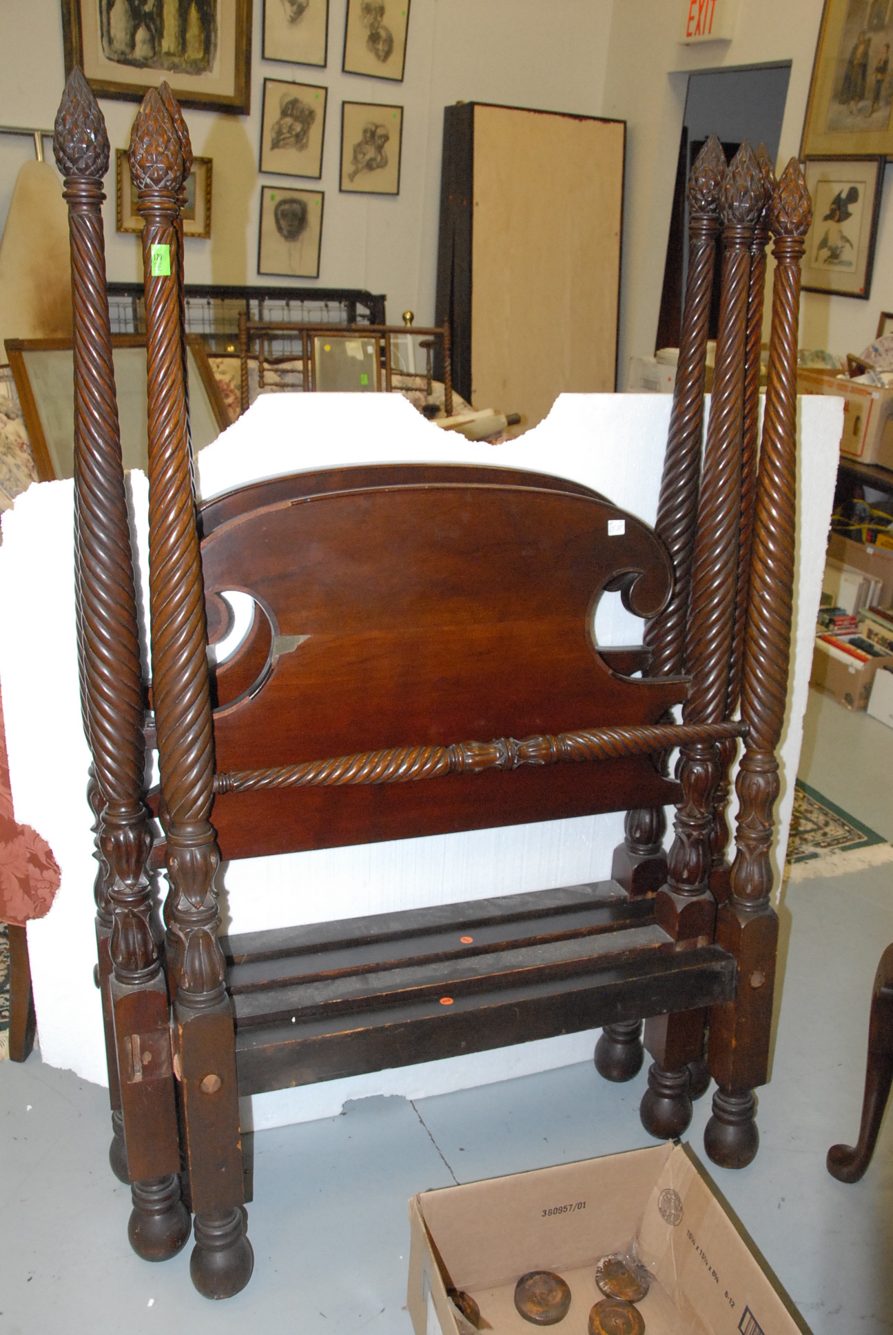 Pair of mahogany tall four post beds with custom platform boxspring, veneer chips on one headboard.
