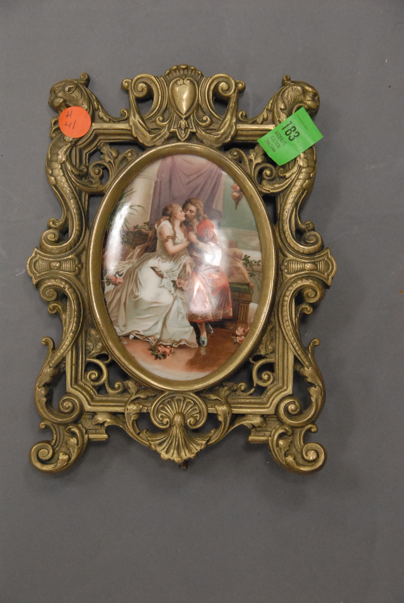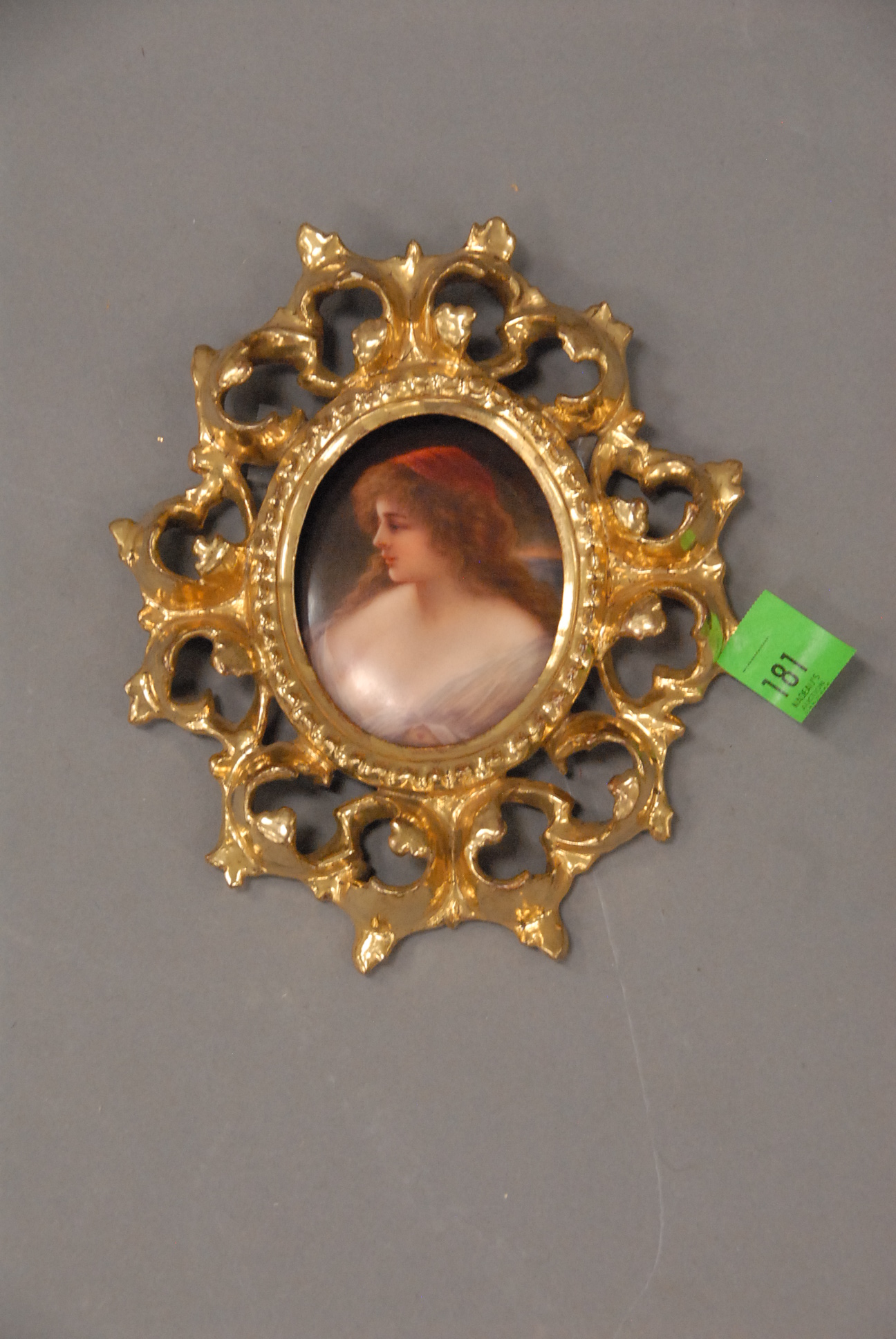 Painting on porcelain in a gilt frame of a partially clad woman.