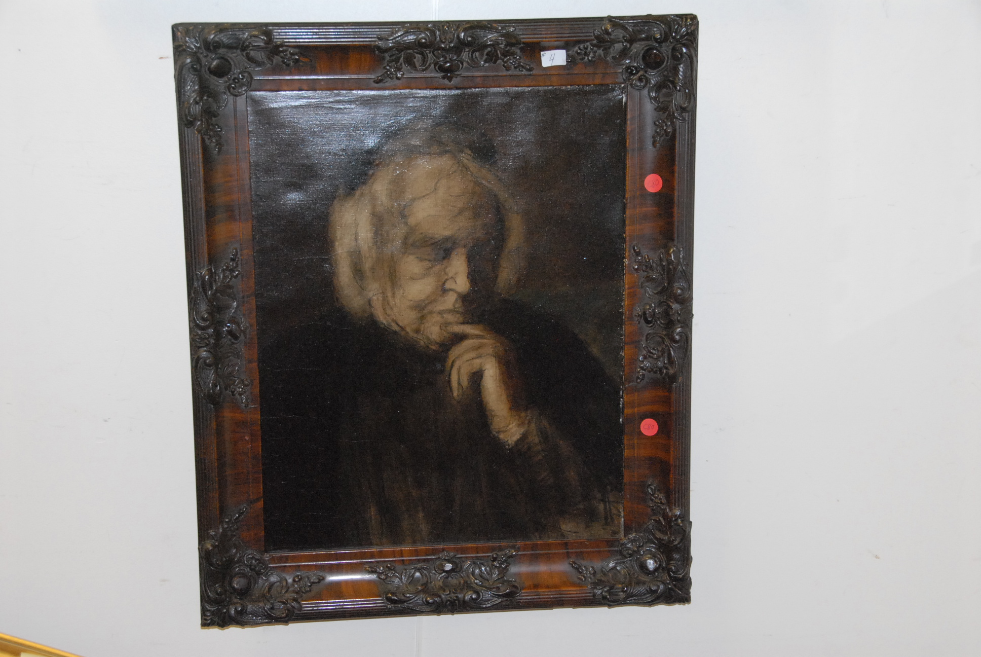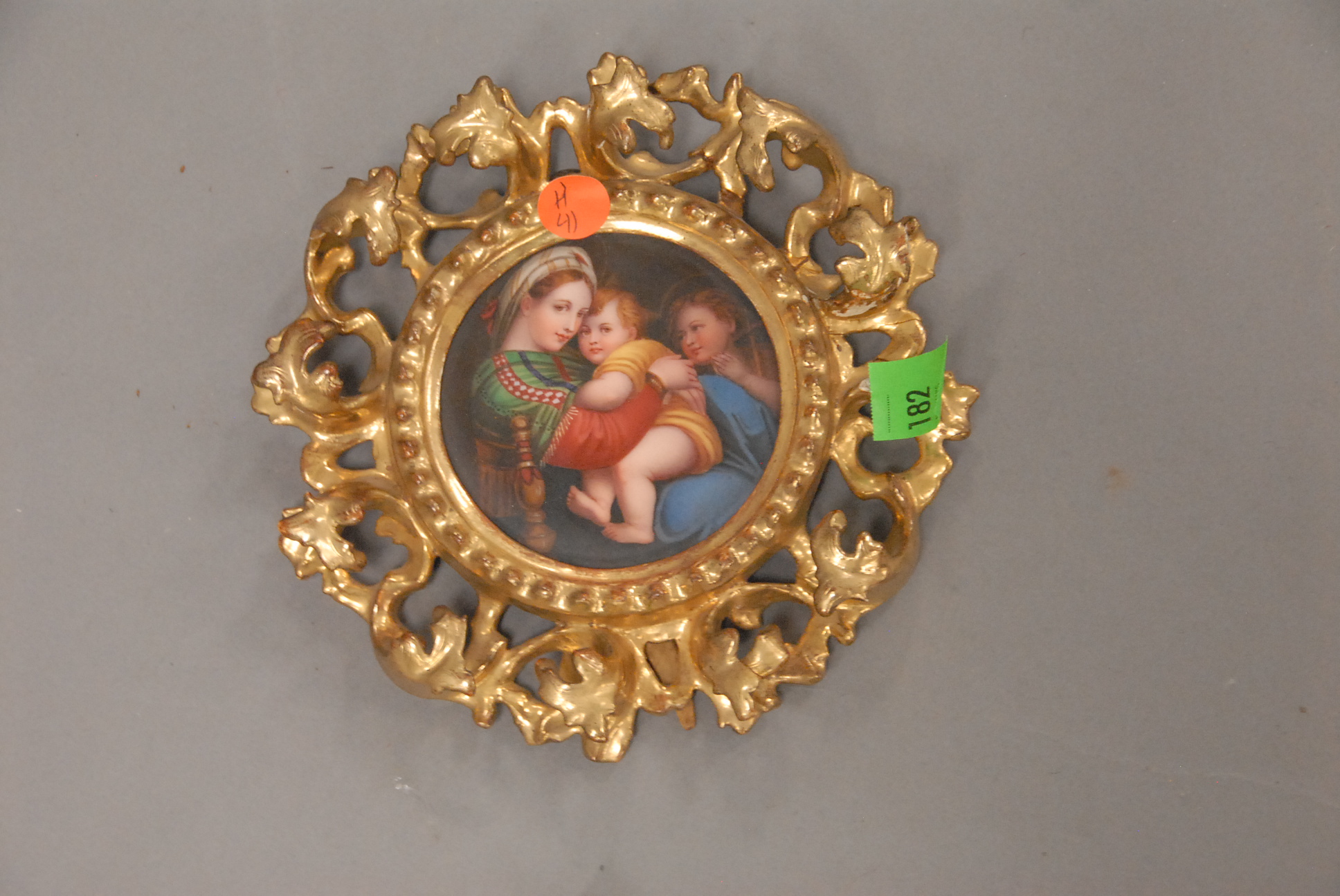 Painting on porcelain armchair Madonna, in a gilt frame.