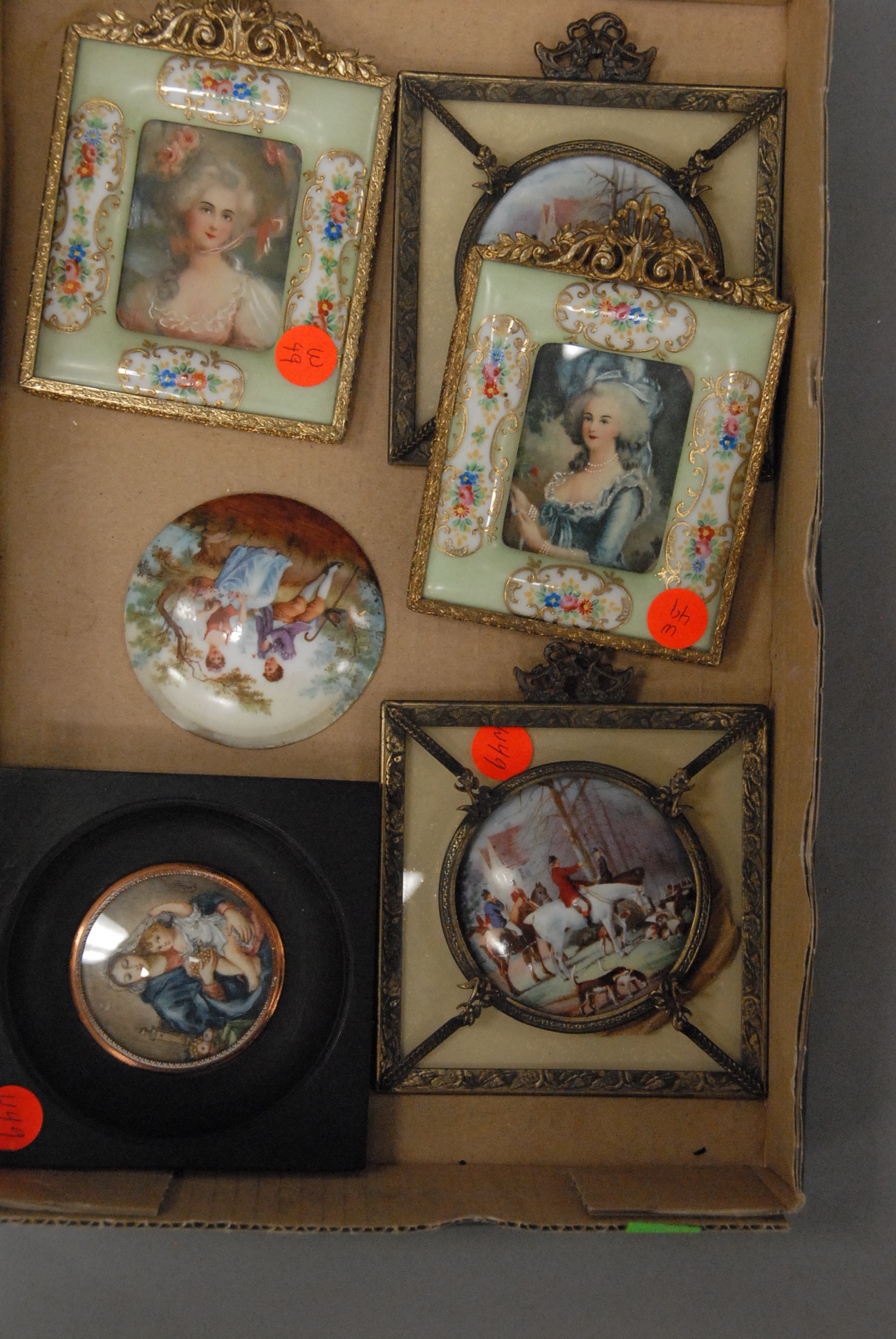 Box lot of porcelain frames and paintings, and a miniature painting on ivory.