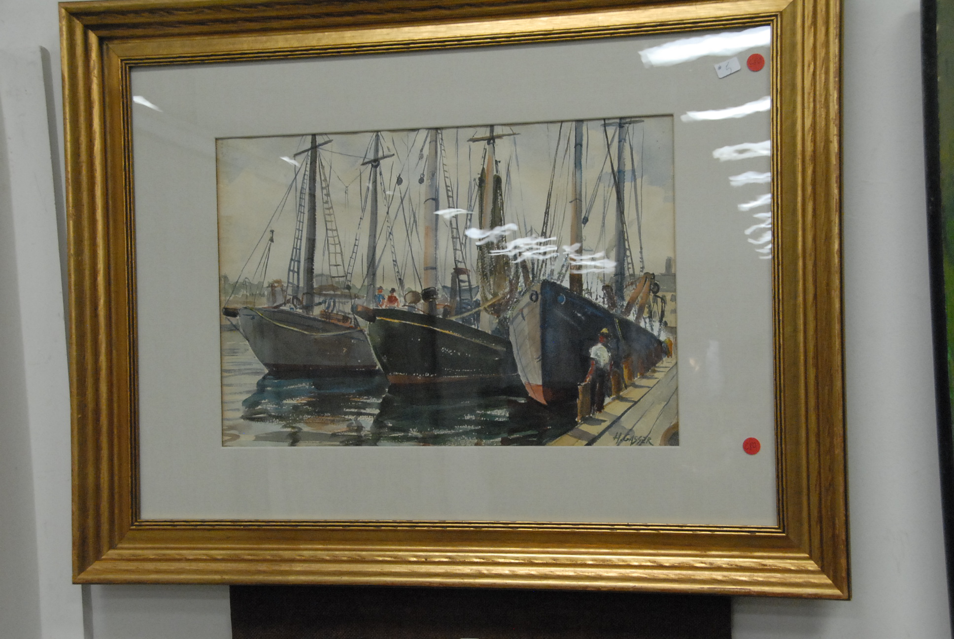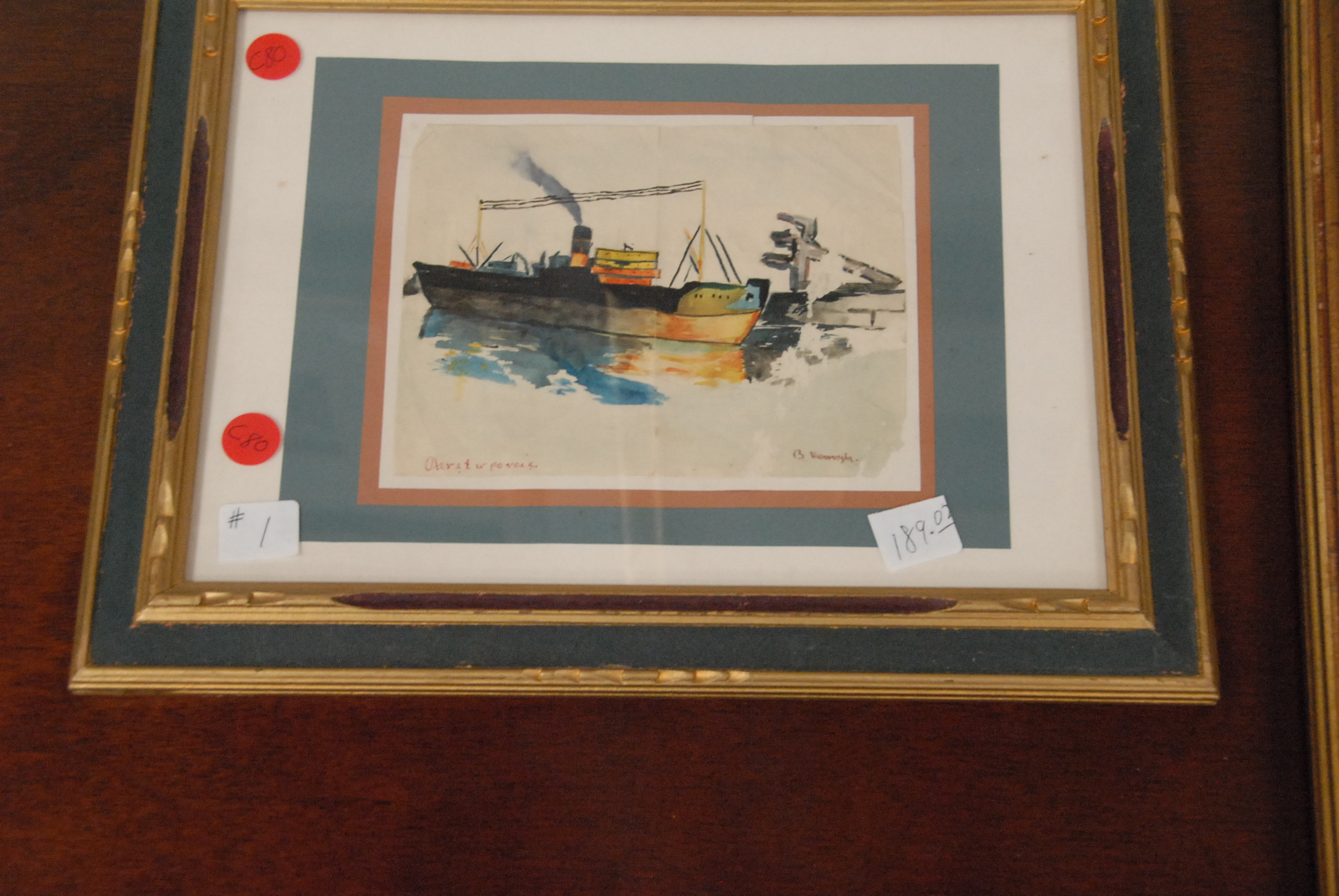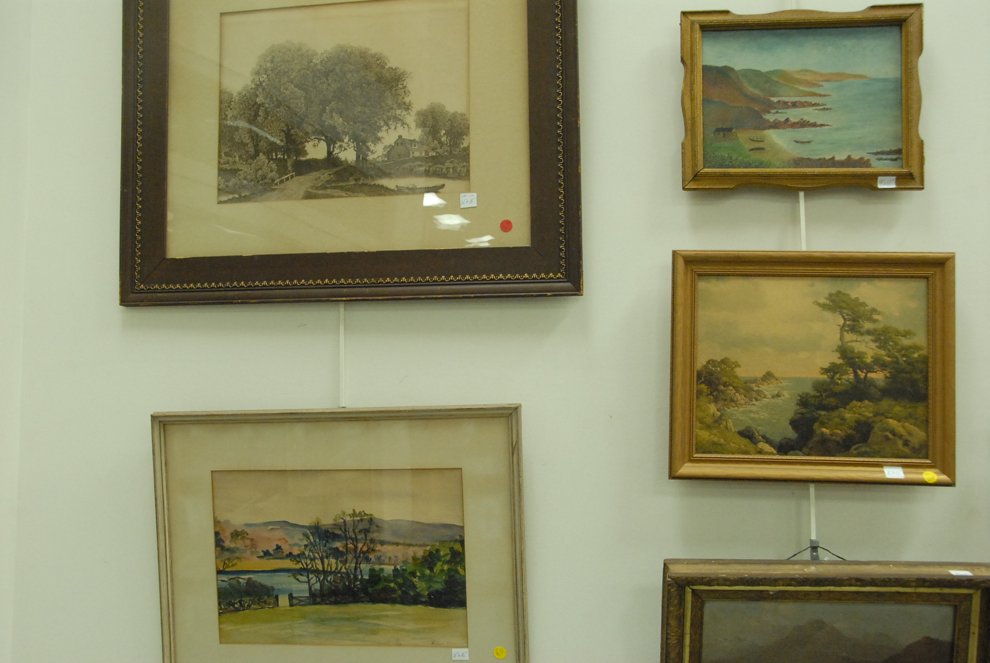 Five piece lot including two prints, two watercolors, and an oil painting.