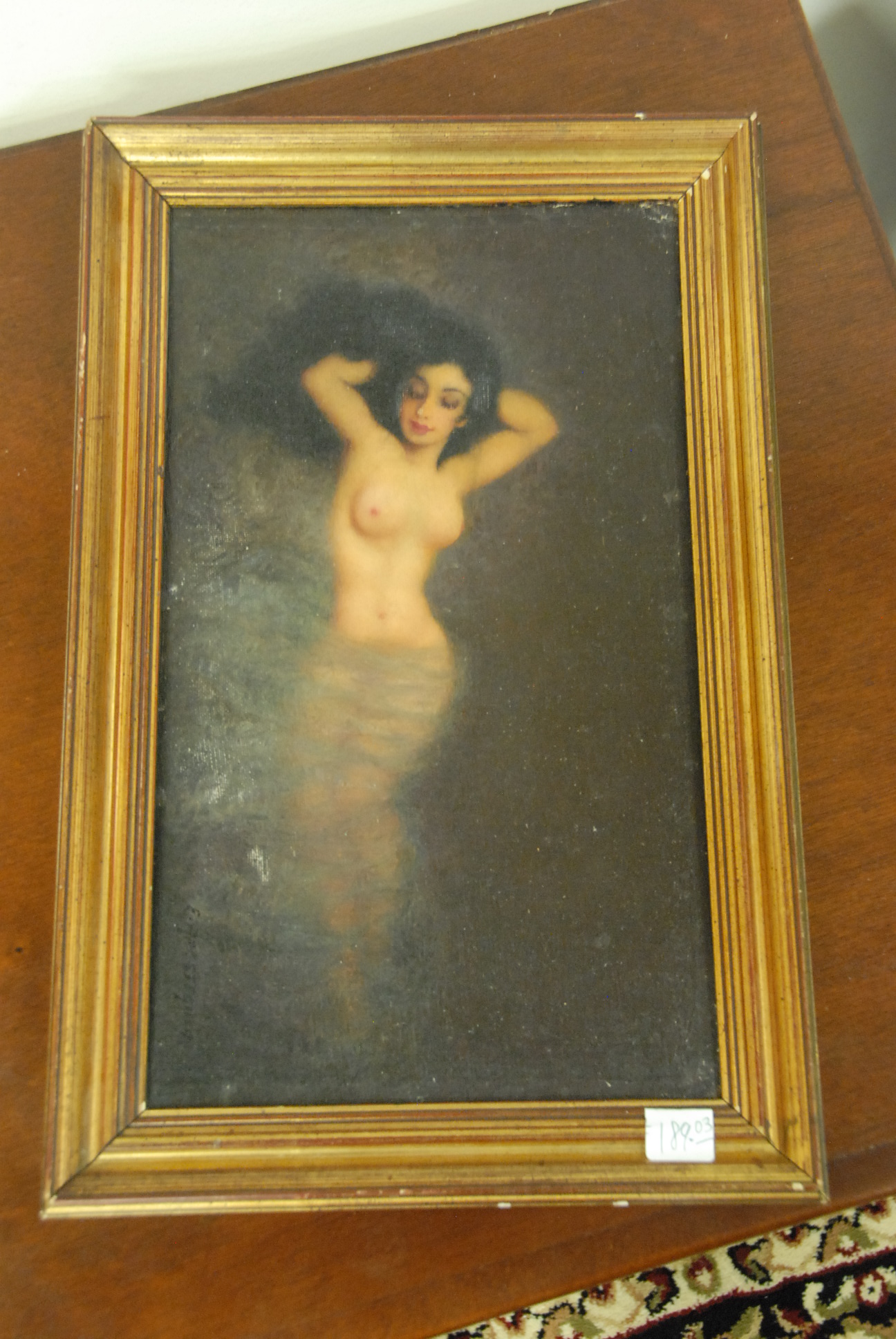 Efron Pelayo Apestequia, Peruvian oil on canvas mounted on board of a nude woman, signed E. Apestequia.