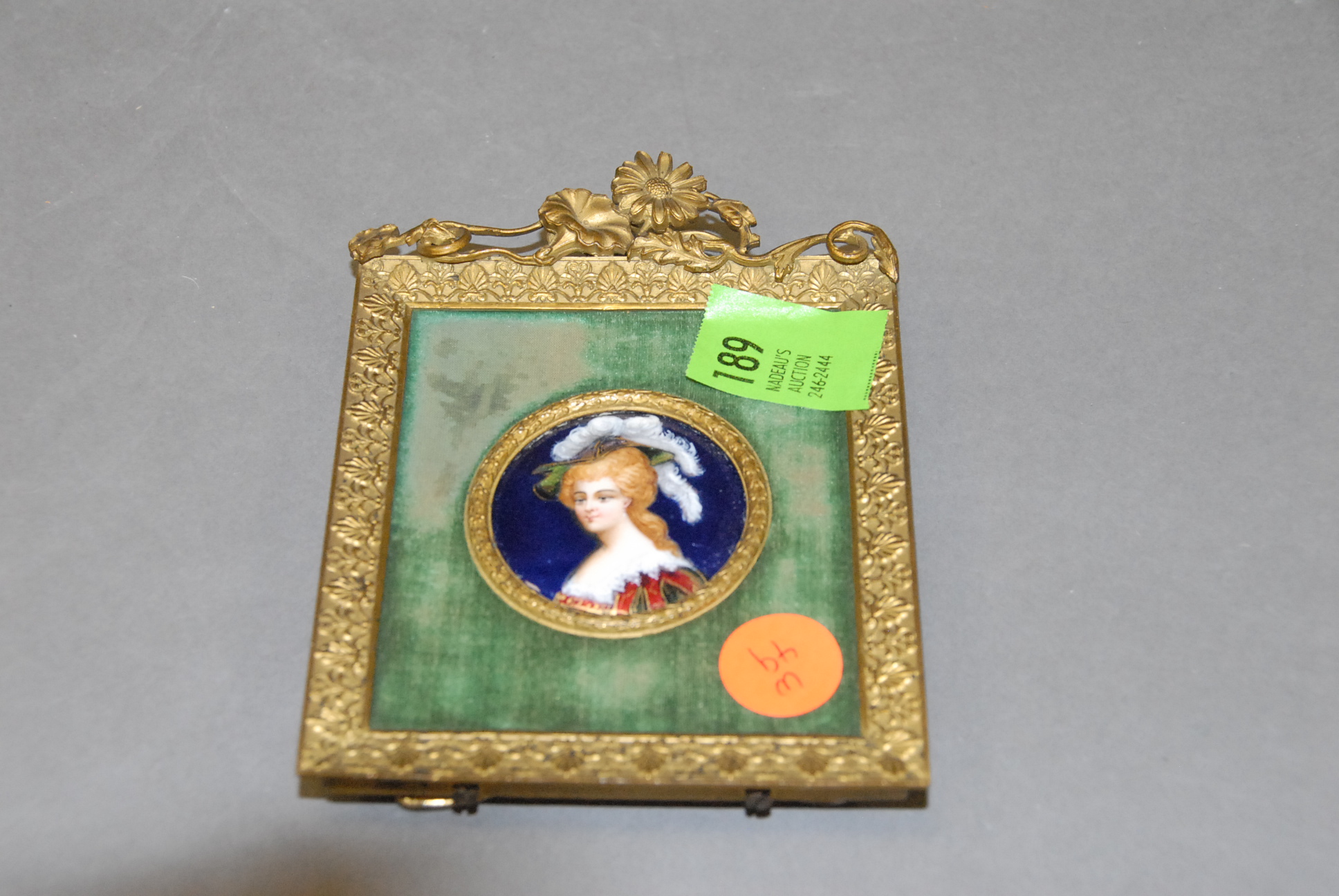 French enamel plaque of a woman in an Ostrich hat in a gilt metal frame.