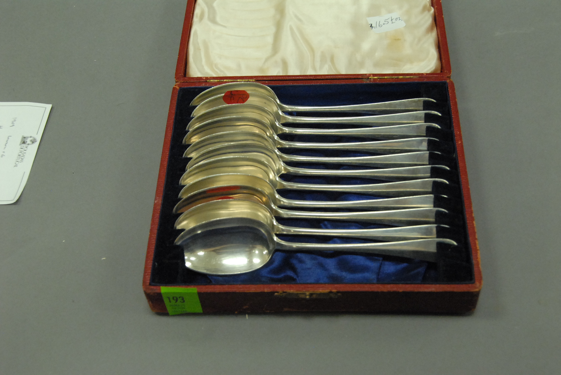 Set of eleven silver spoons in a fitted case marked 1909 Lawson & Company, made in Glasgow16.5 troy oz.