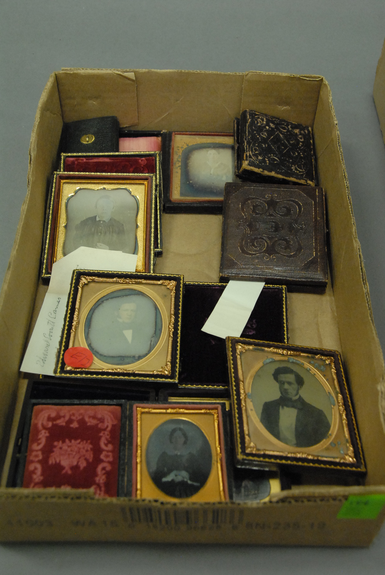 Group of eight daguerreotypes including group of women and a group of men, children.
