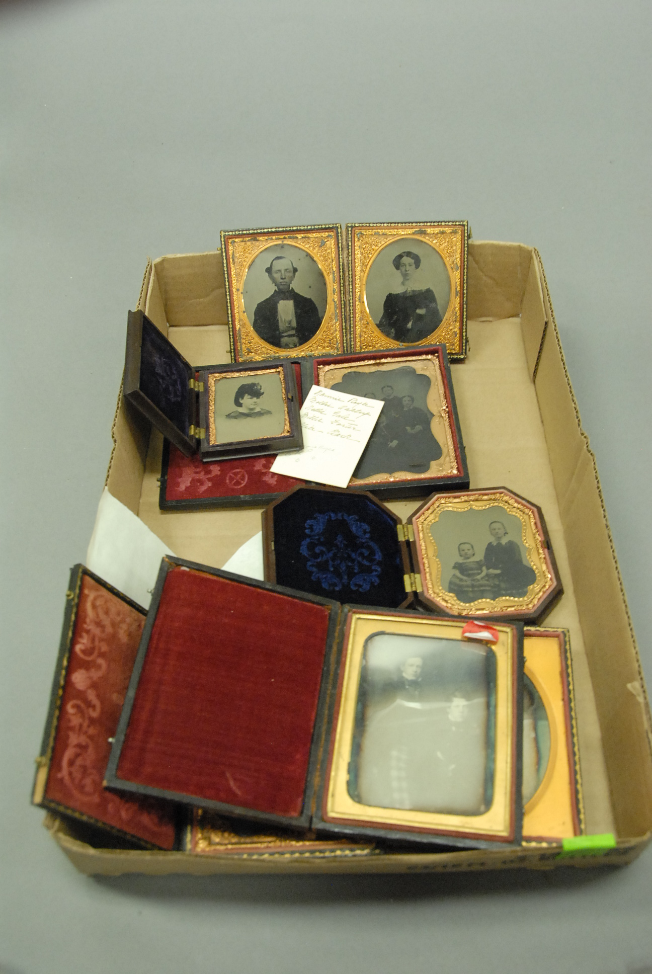 Group of twelve tin-types and ambrotypes of men, women, and children.