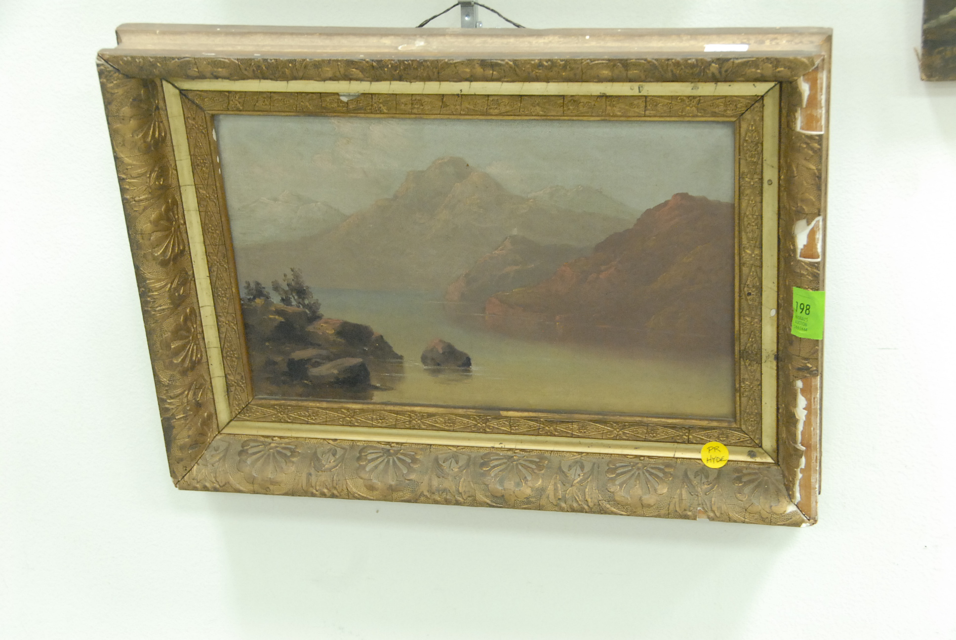 Two oil paintings one with a seascape and one with a mountain and lake scene.