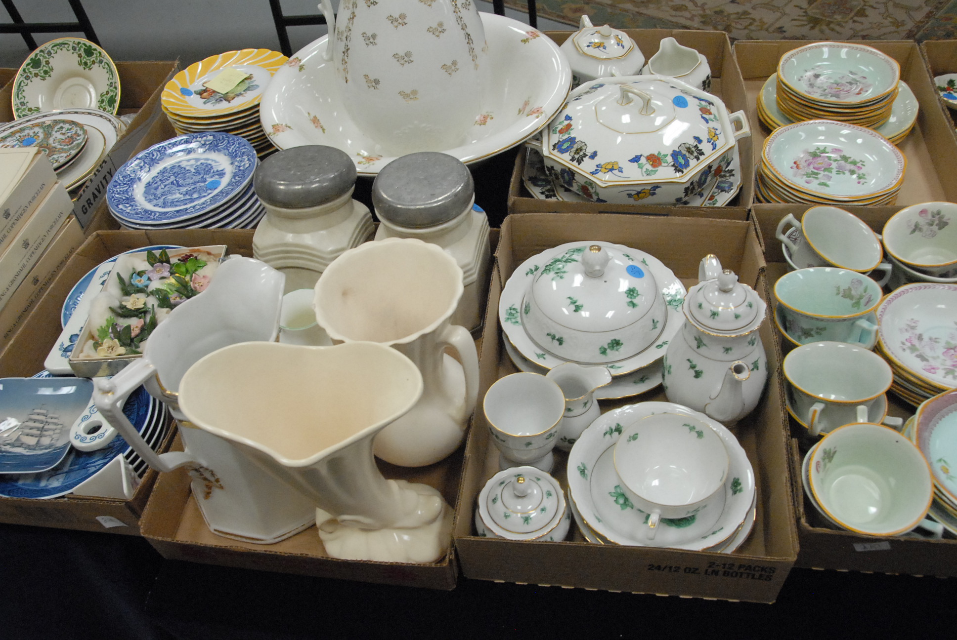 Twelve box lots including a pitcher, bowl, rose medallion plates, an ivory crucifix of Jesus, blue and white china, vases, silver plate, German breakfast set, and miscellaneous.