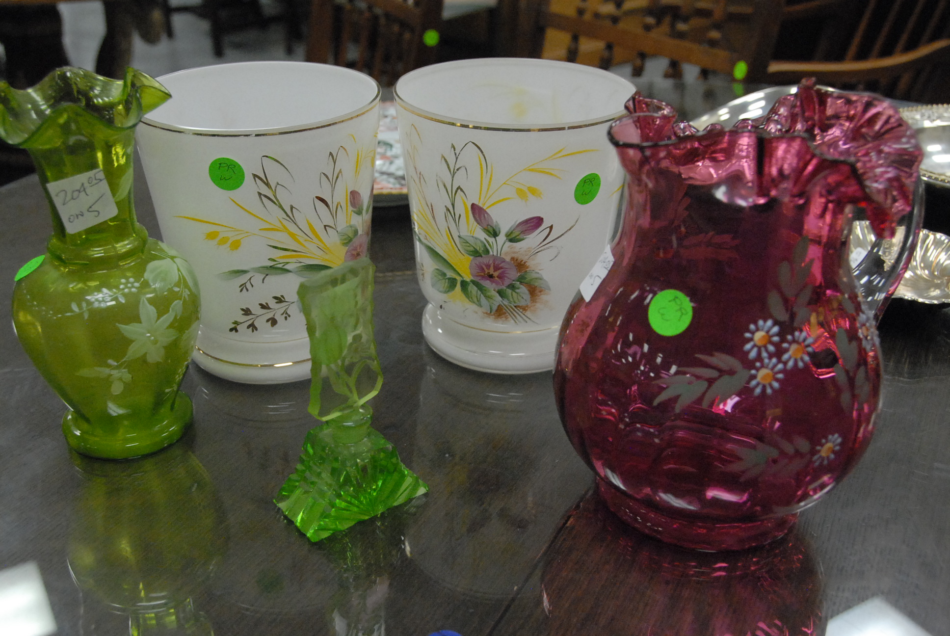 Five piece lot to include a perfume bottle, green vase, ruby red pitcher, and two Bristol glass vases.