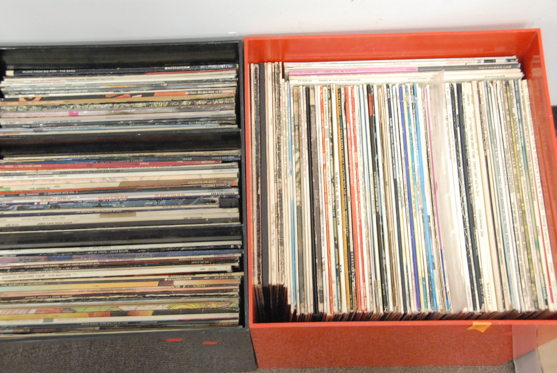 Two box lots of records including The Beatles Abbey Road, Magical Mystery Tour, Revolver, Hey Jude, James Gang, The Rascals, Traffic, Sly and The Family Stone, and more with original covers.
