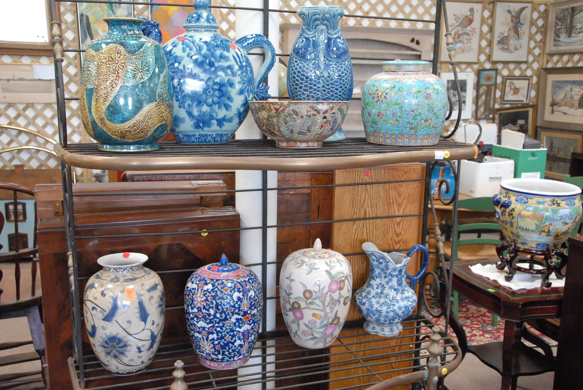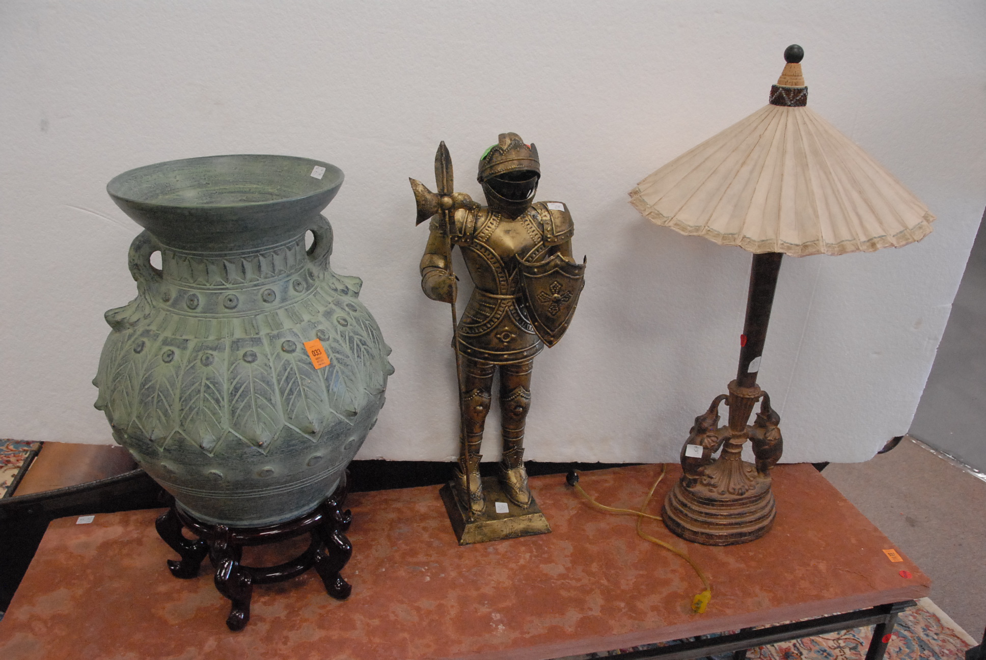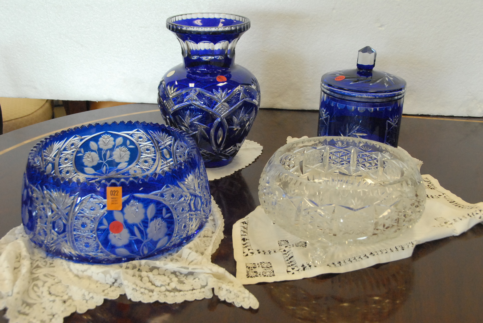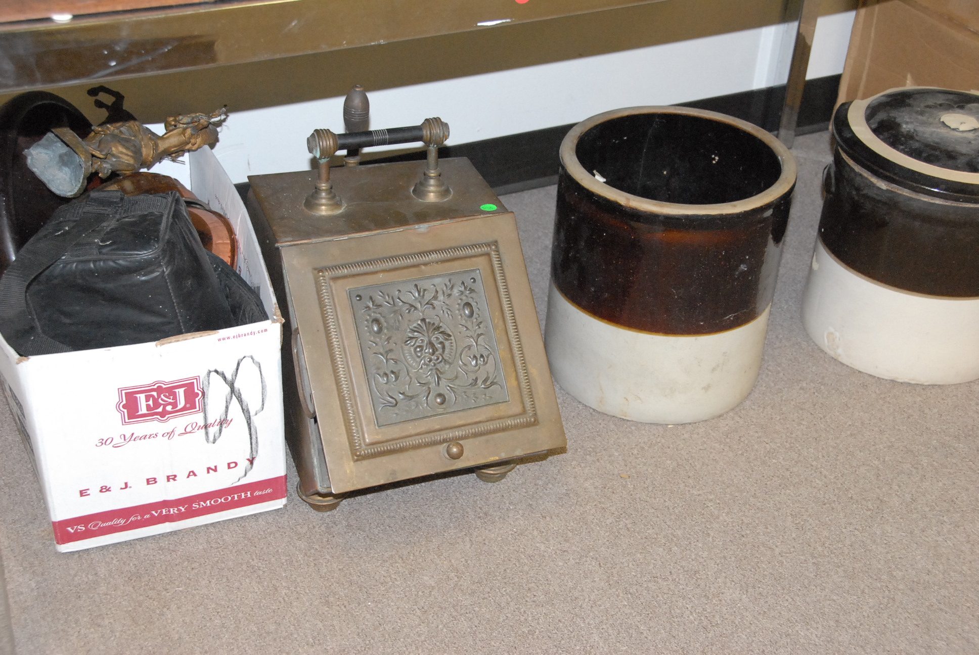 Table lot including clown and religious figures, lantern, clock, group of blue glass, set of Japanese china, pots and pans, and miscellaneous box lots.