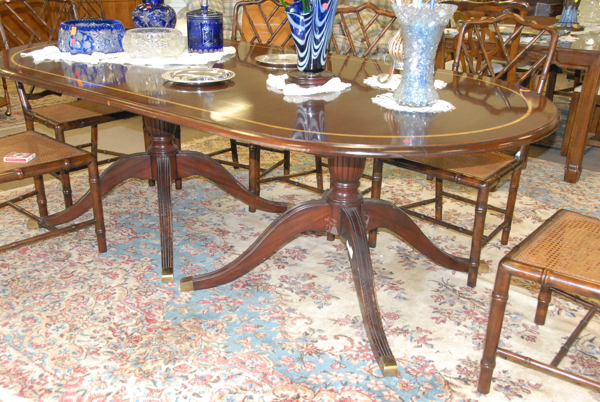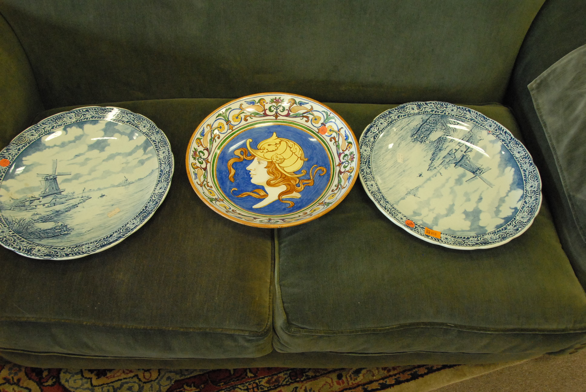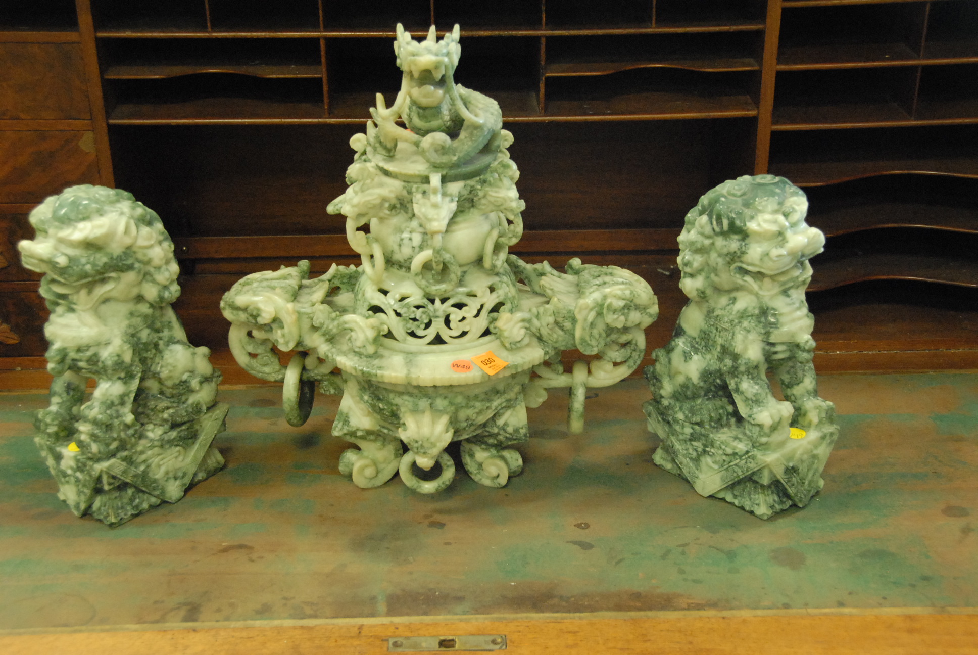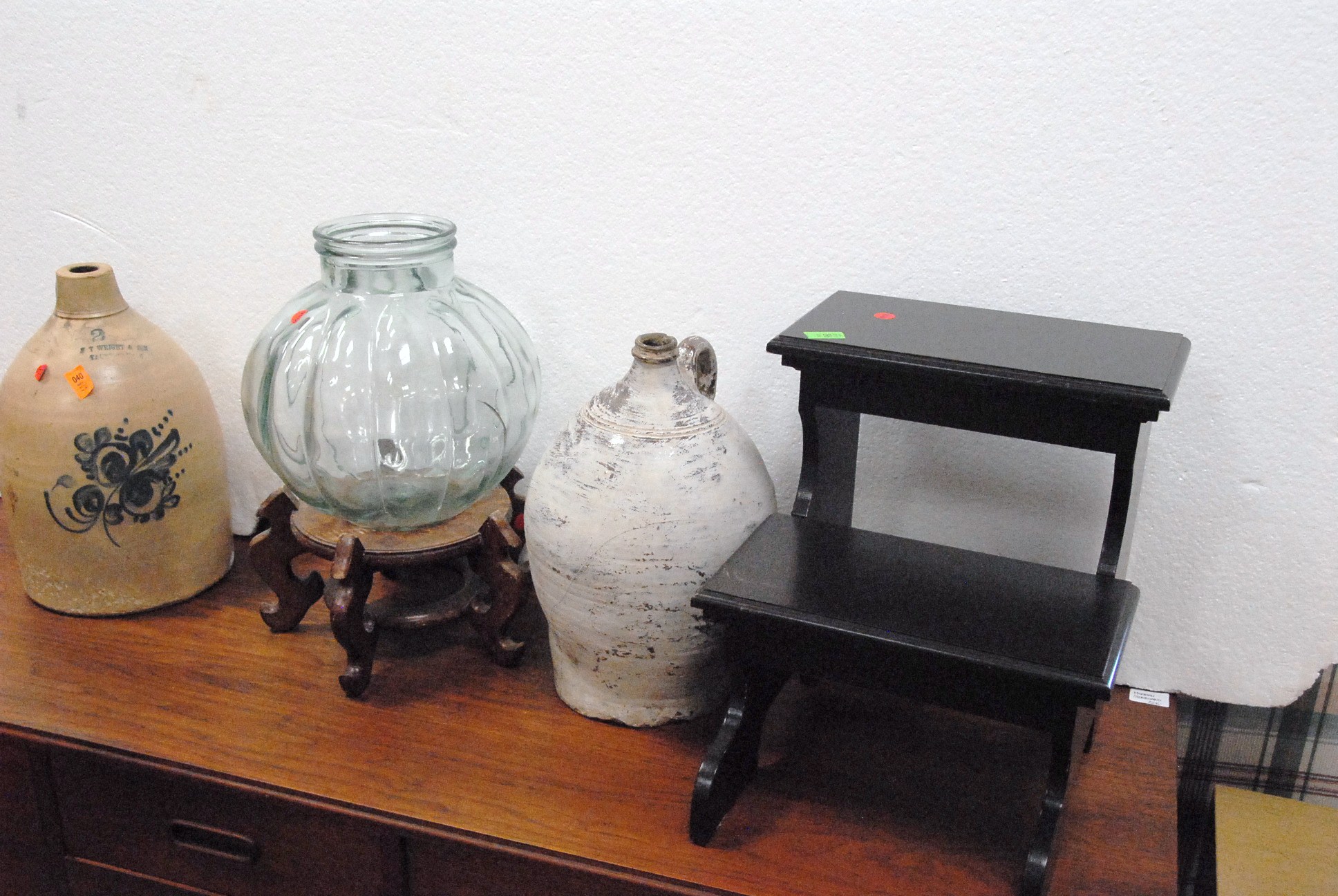 Table lot including clown and religious figures, lantern, clock, group of blue glass, set of Japanese china, pots and pans, and miscellaneous box lots.