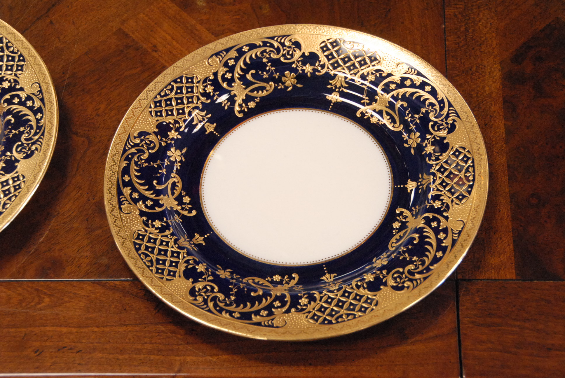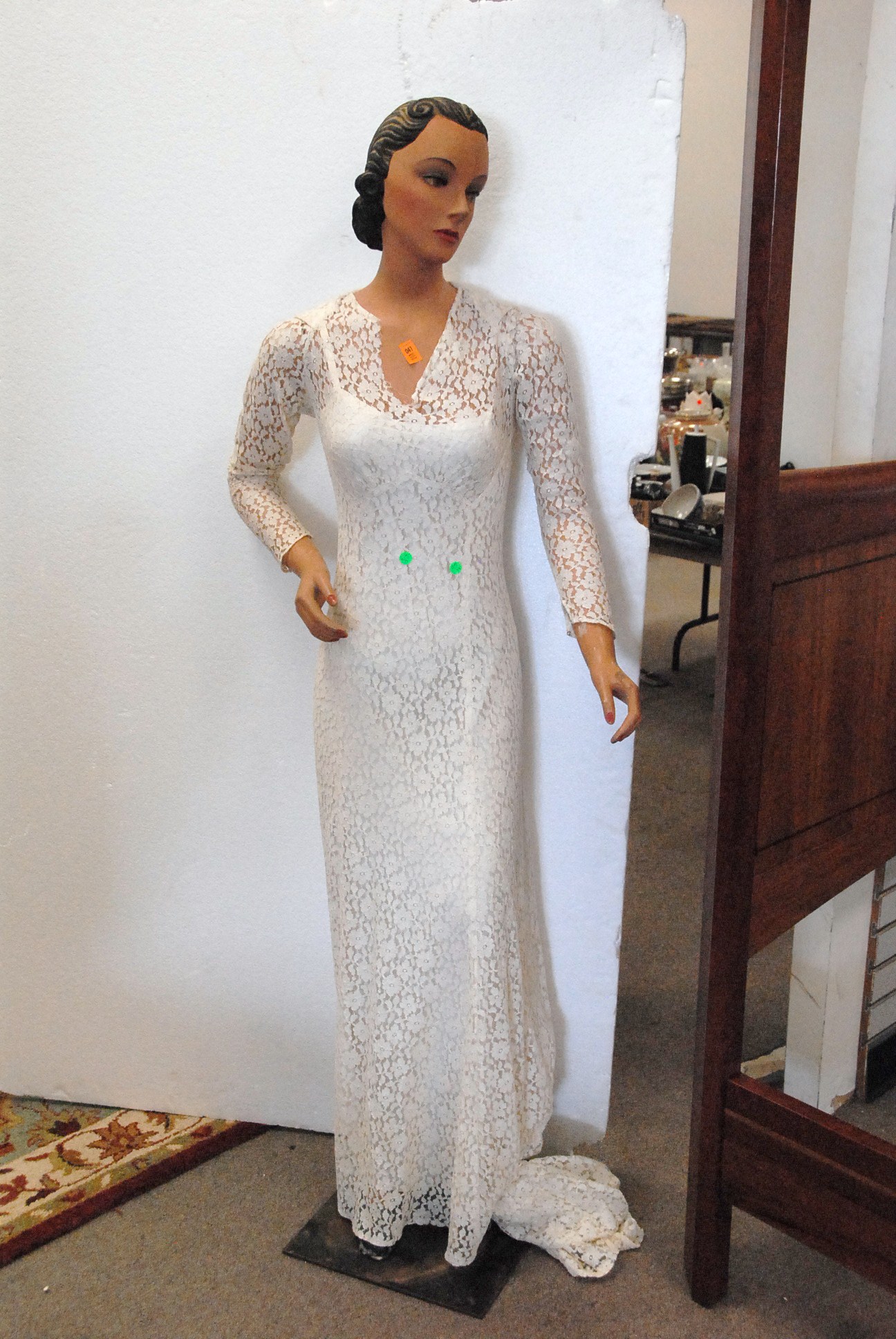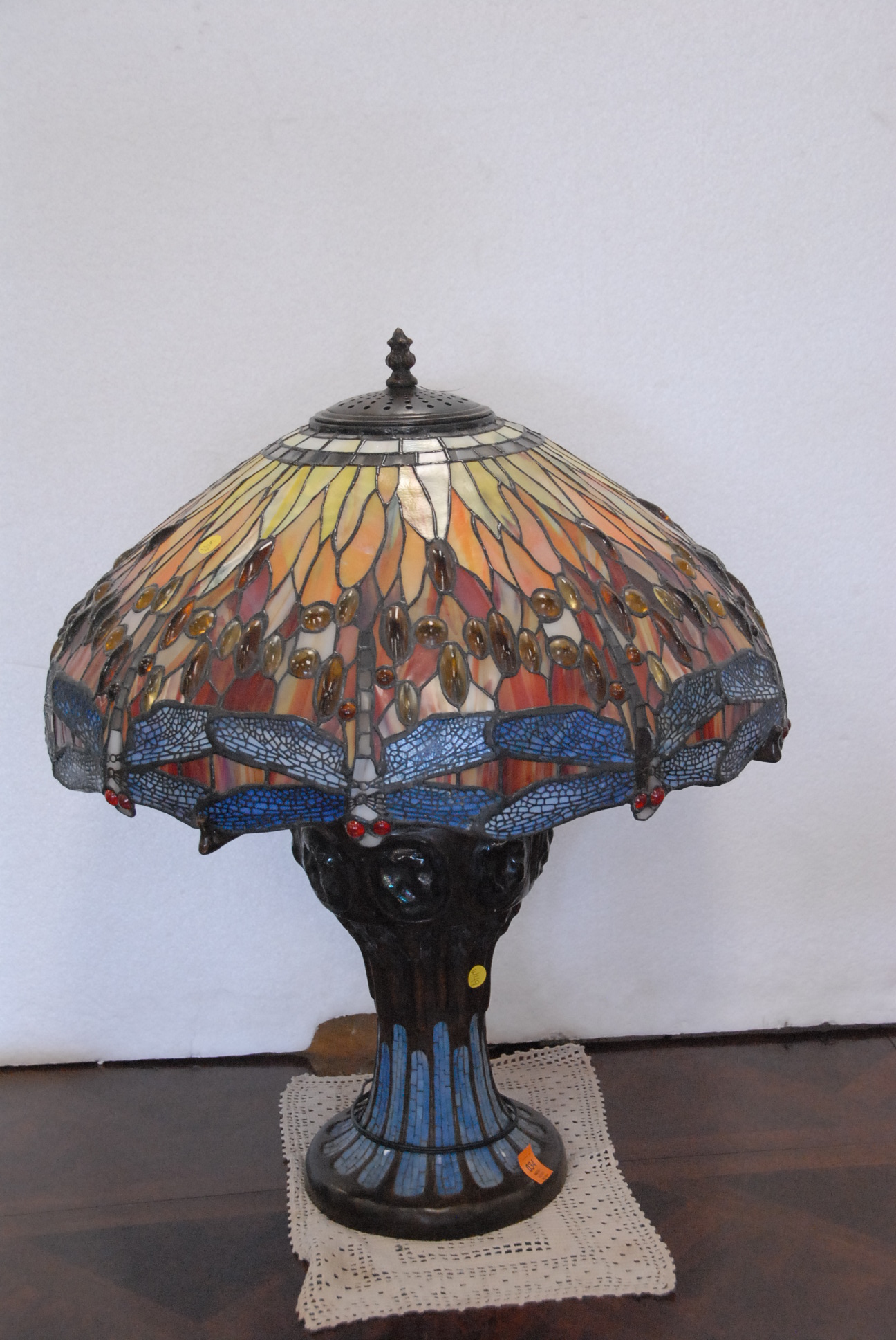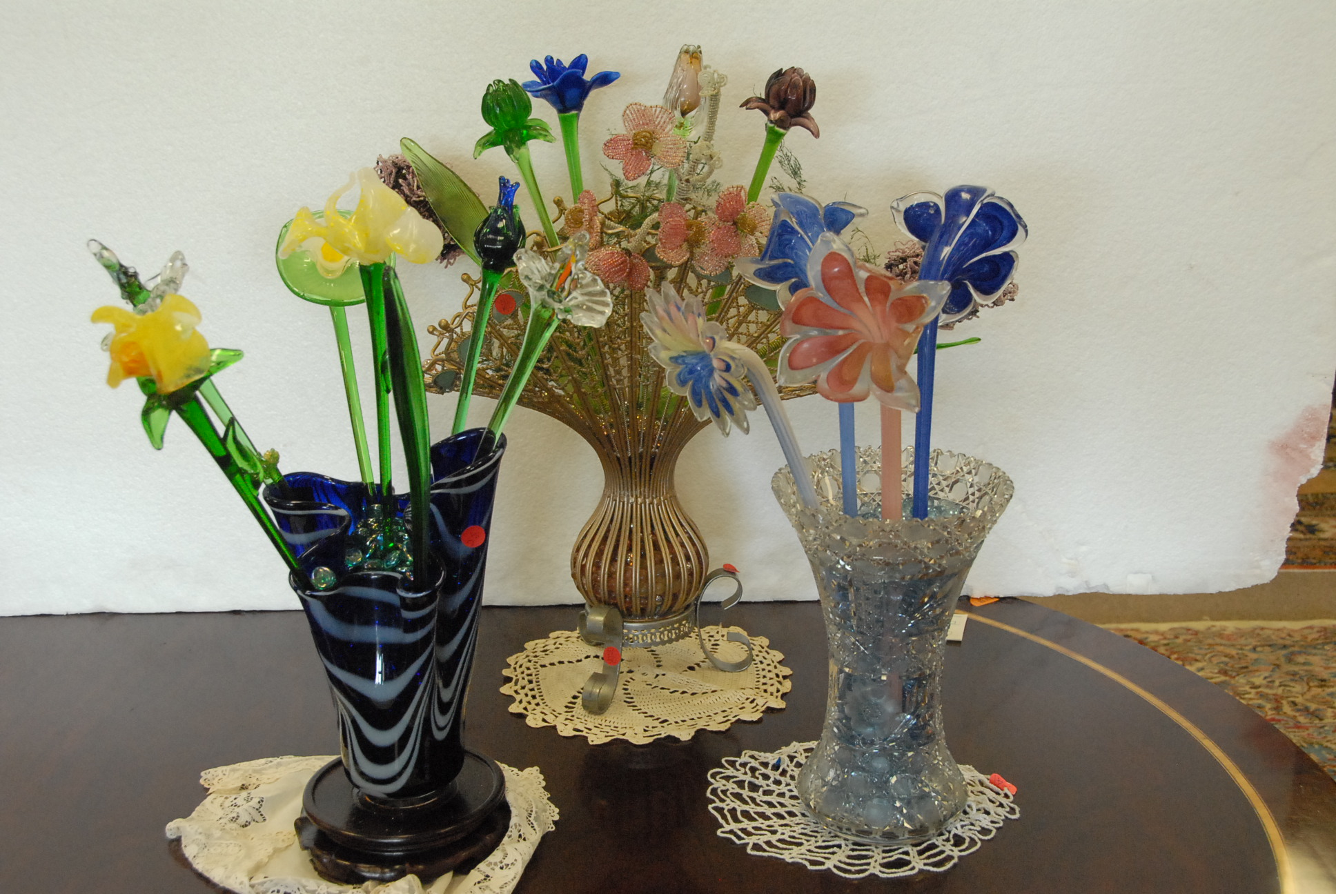 Table lot including clown and religious figures, lantern, clock, group of blue glass, set of Japanese china, pots and pans, and miscellaneous box lots.