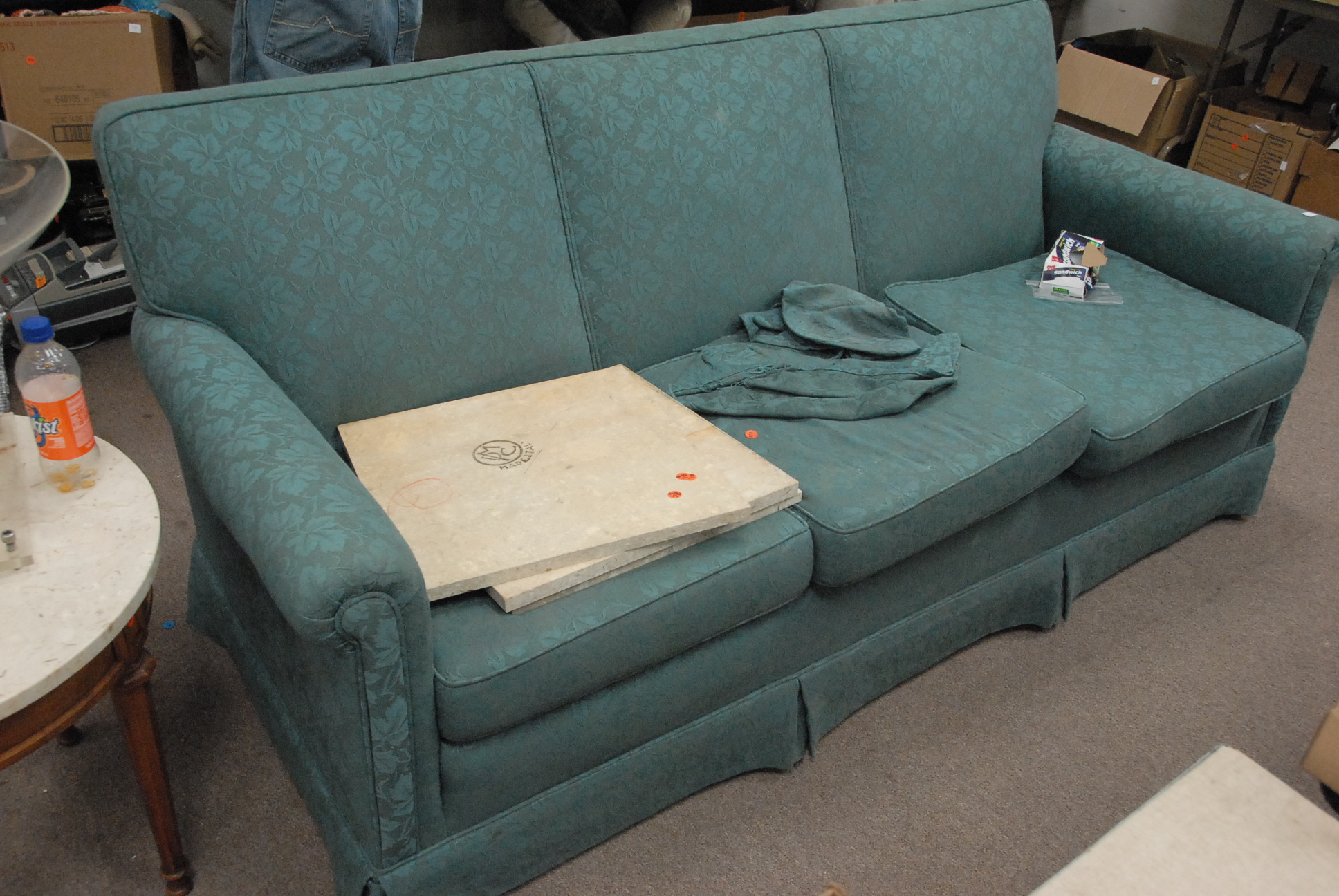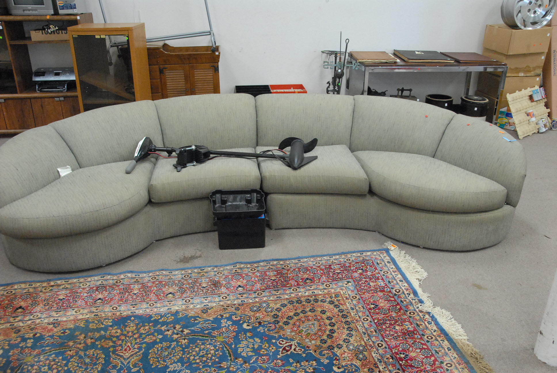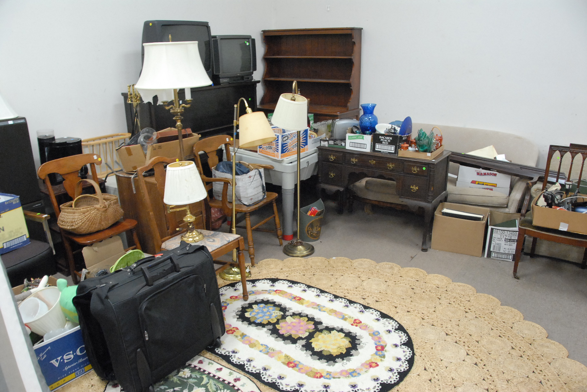 Large grouping to include HP computer, HP photo printer, large box of prints, two televisions, love seats, chairs, television stand, vanity, lamps, piano, maple hutch, lounge chairs, speakers, box lots, etc.