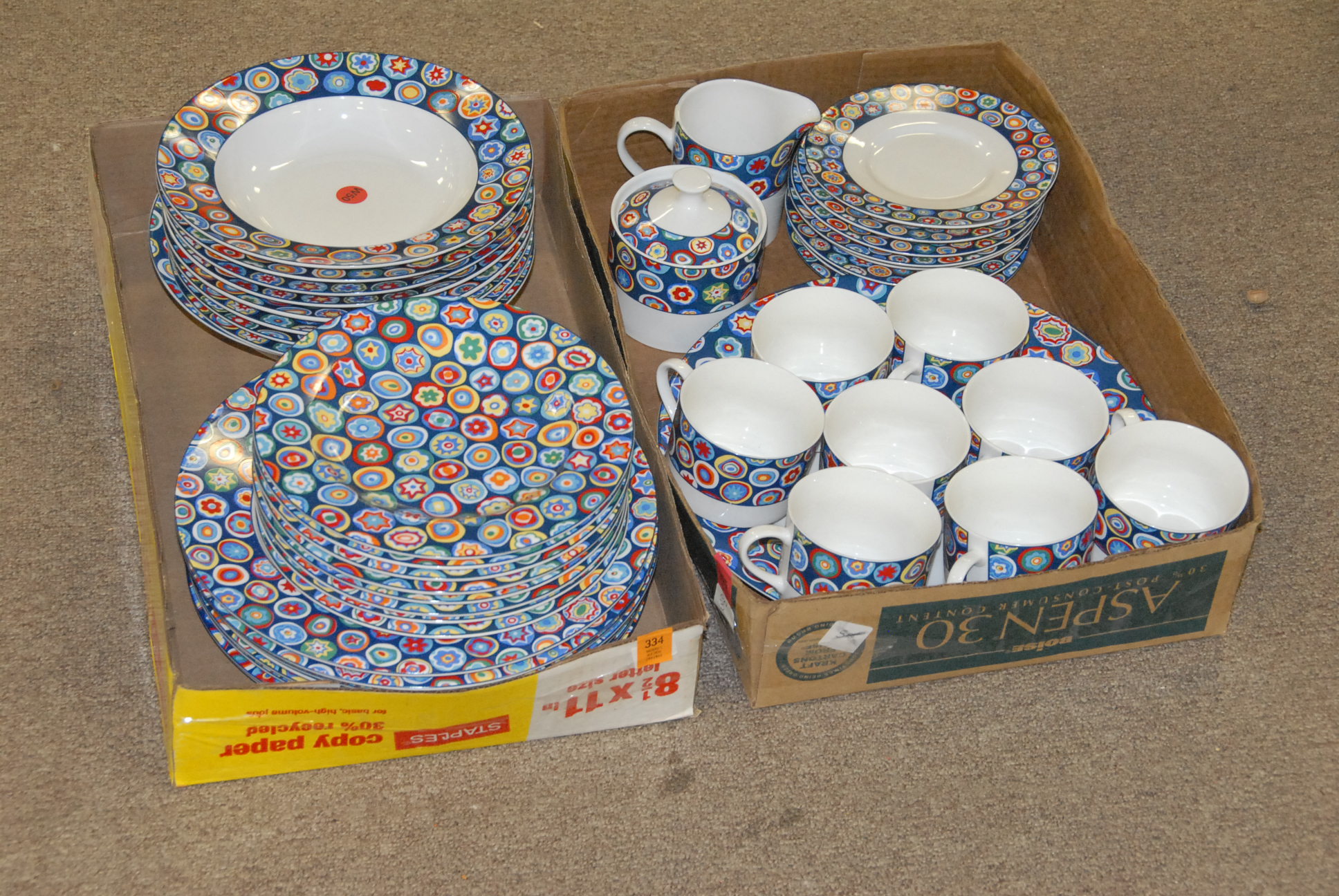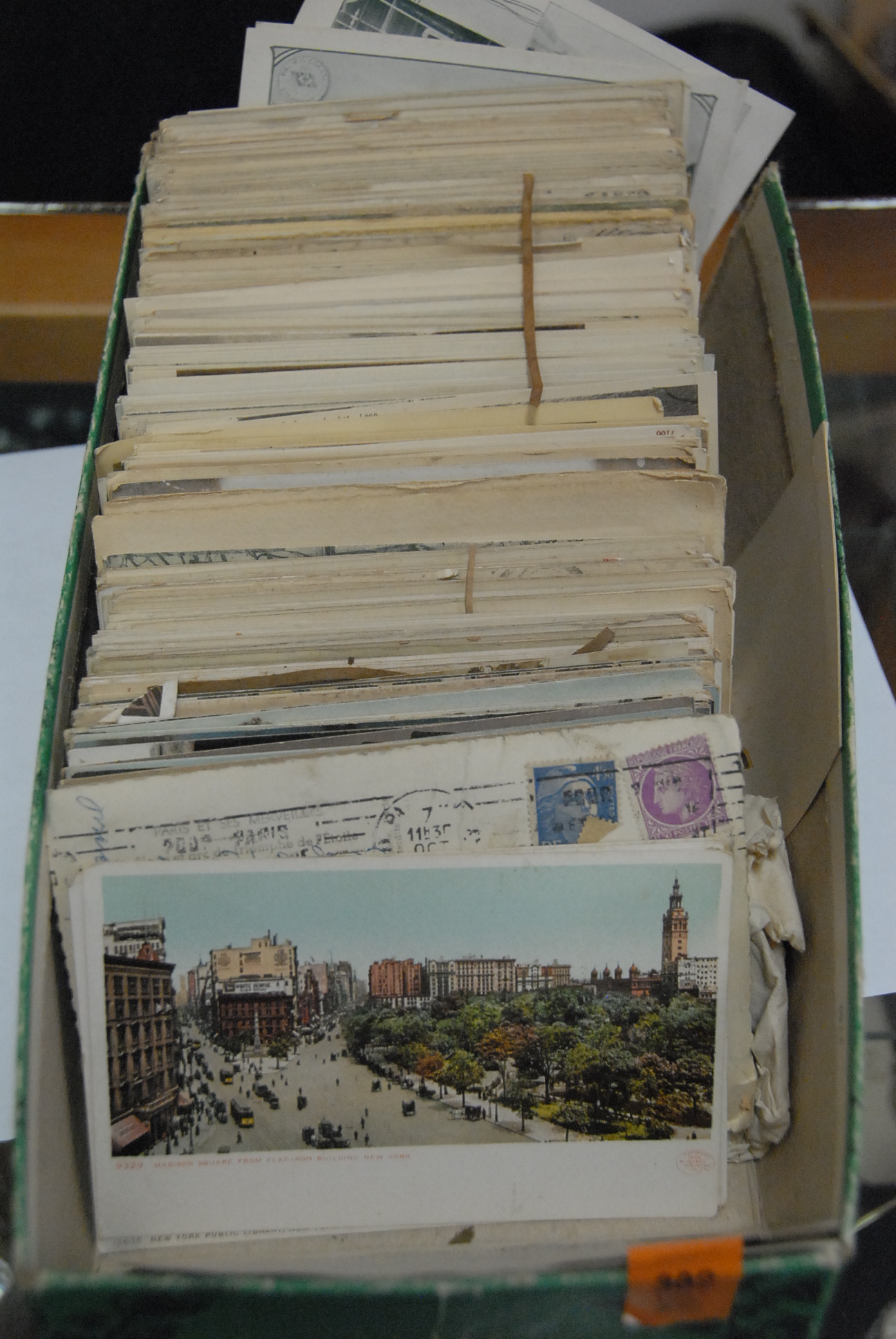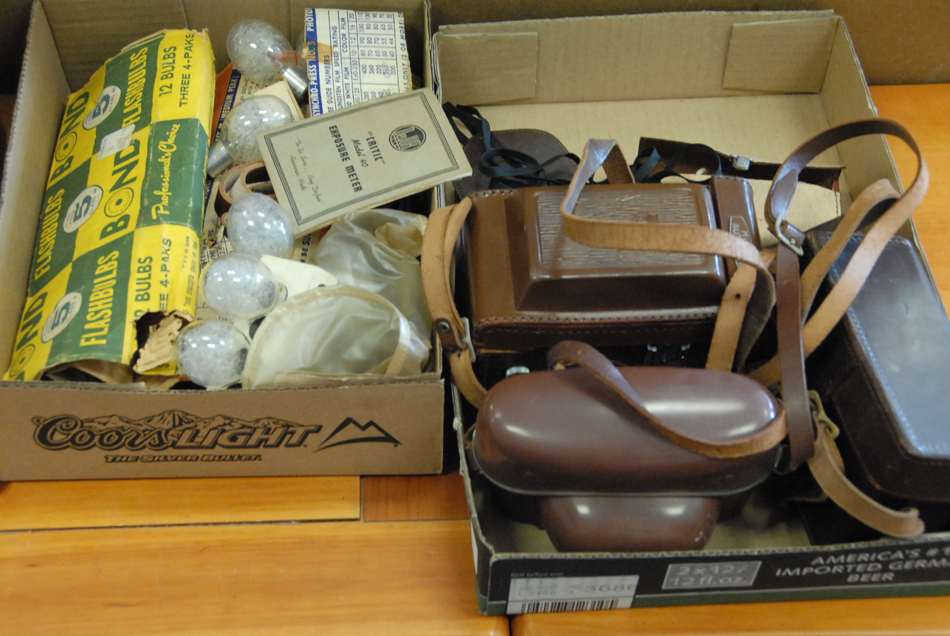 Table lot of boxes to include vases, bowls, silver plate, revolving serving dish, and an antique German bisque head doll, as is.